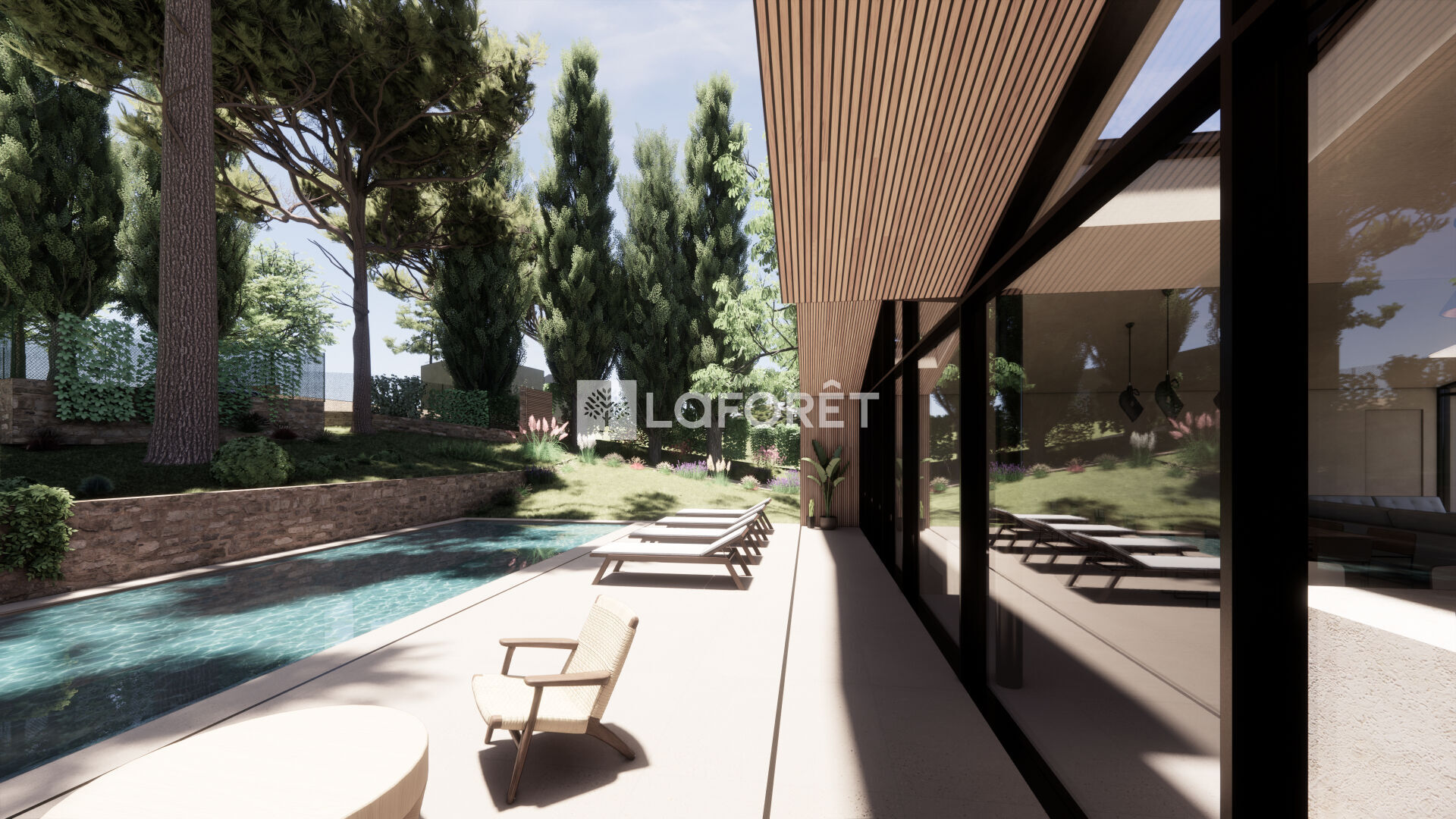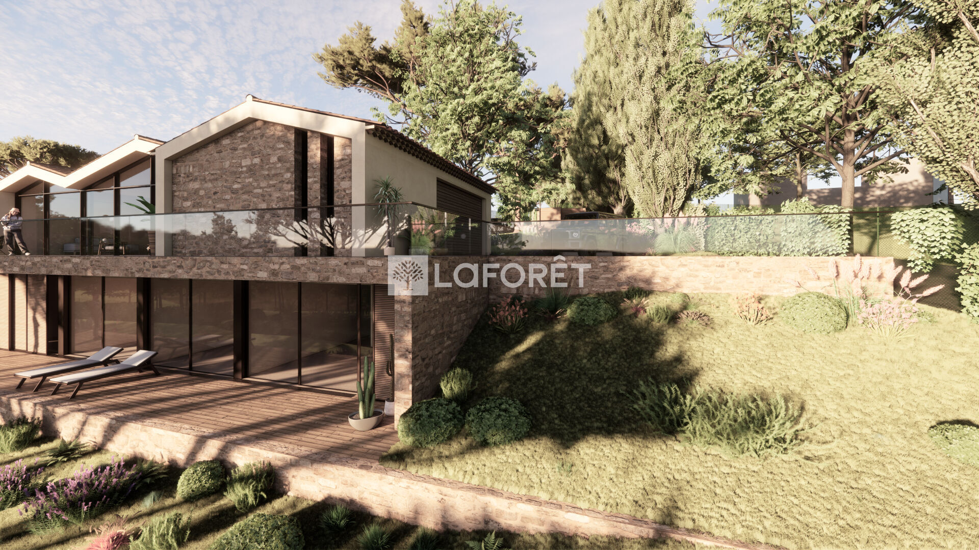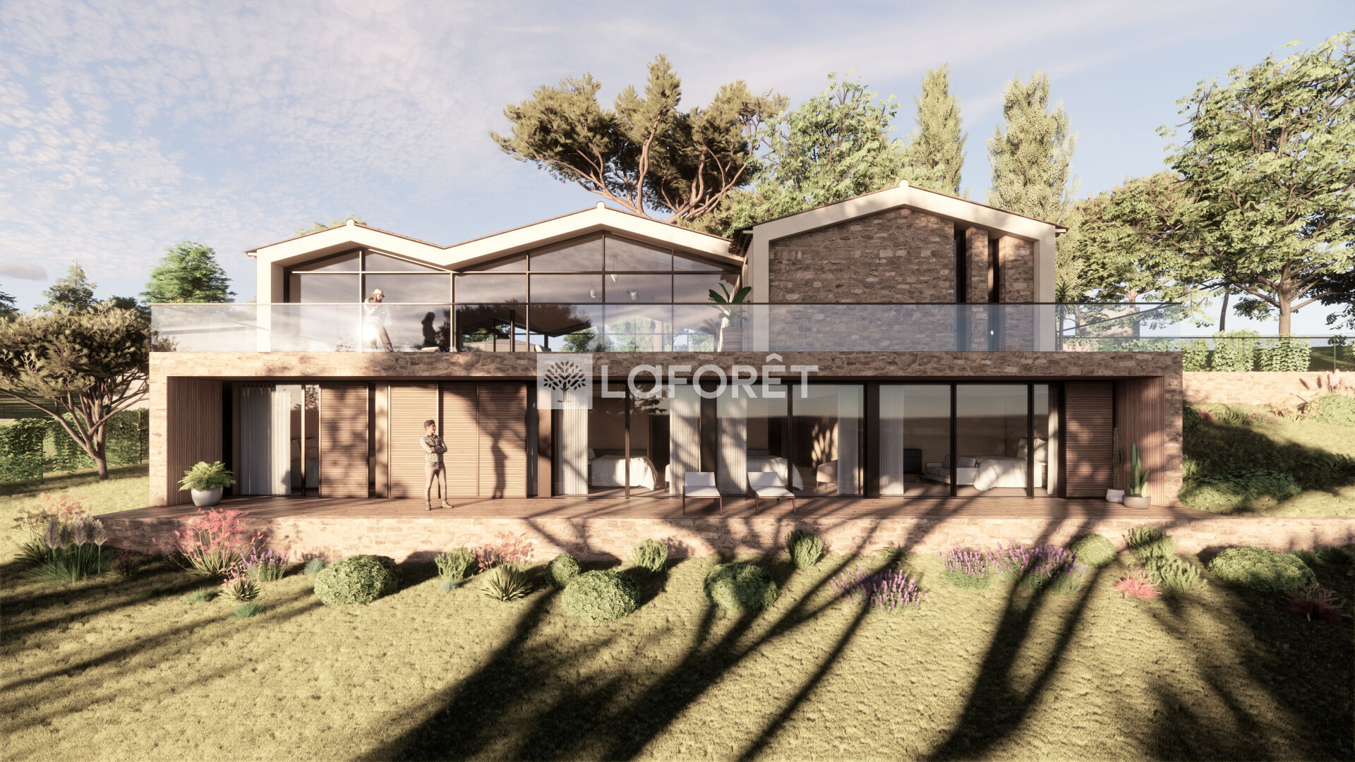 La villa imaginée allie modernité et tradition, avec ses volumes généreux, baies vitrées, tuiles provençales et une intégration parfaite dans le paysage :
