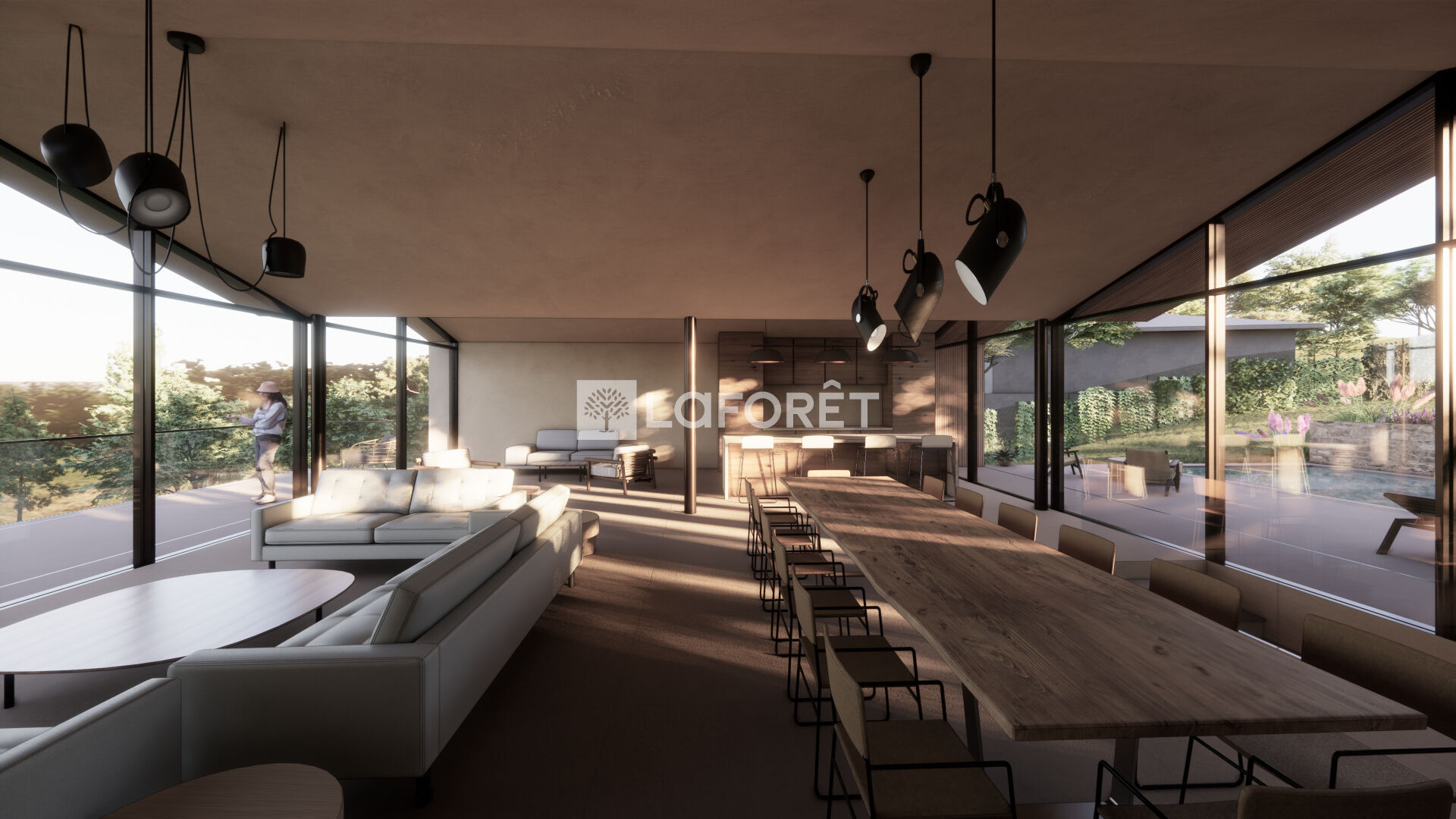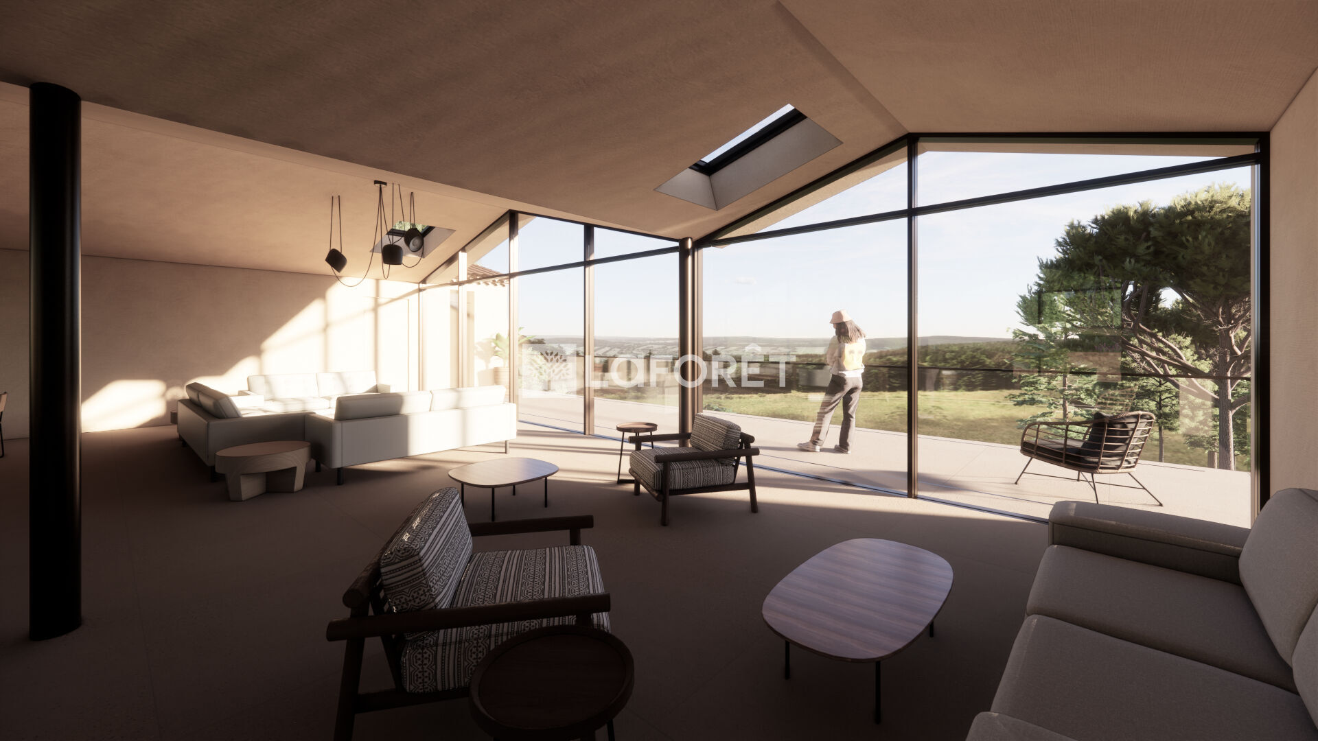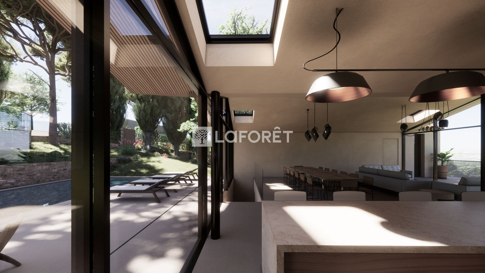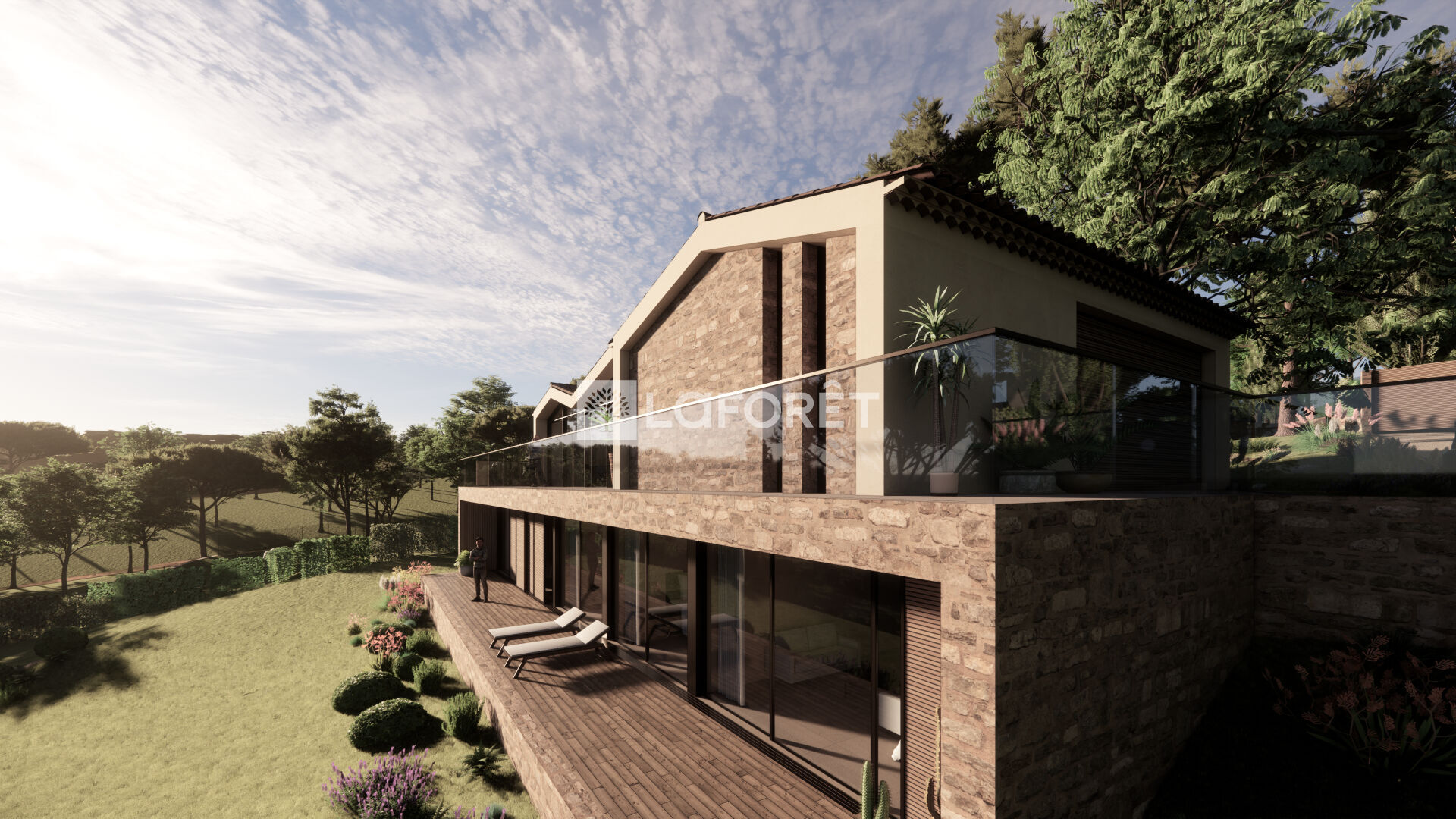 La villa imaginée allie modernité et tradition, avec ses volumes généreux, baies vitrées, tuiles provençales et une intégration parfaite dans le paysage :