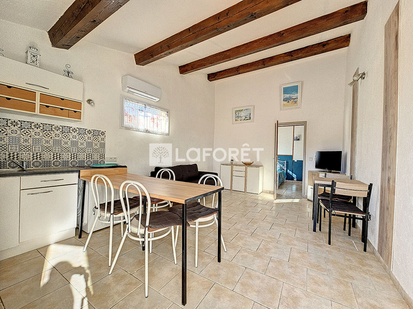 D'une pièce à vivre avec cuisine aménagée (frigo, plaques induction, hotte, four micro-onde, machine à laver, rangement) ouvert sur le séjour, une chambre avec lit double et rangement, une salle d'eau avec wc.