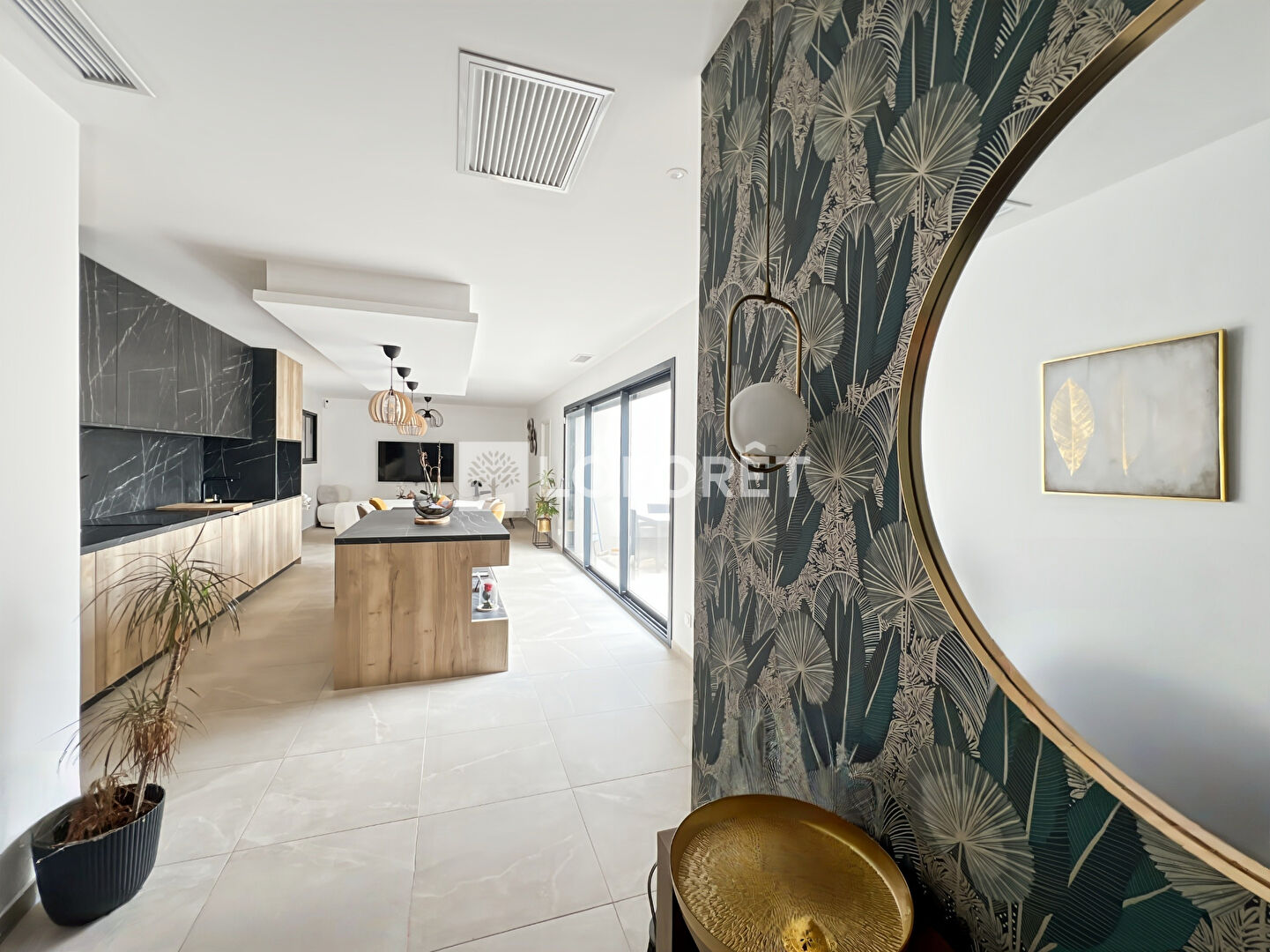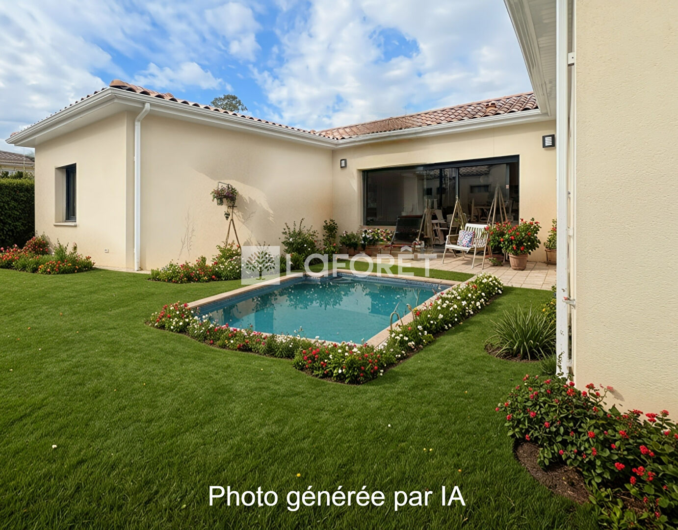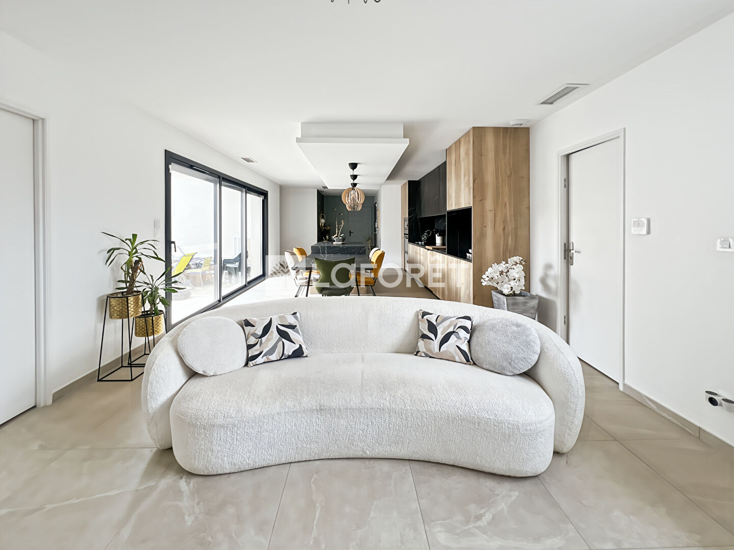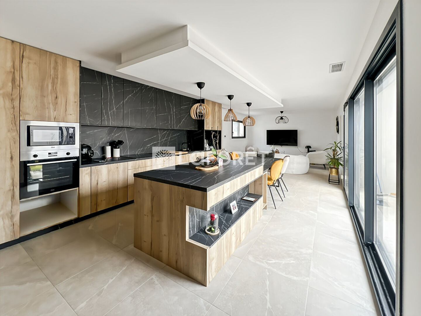 La maison s'organise autour d'une belle pièce de vie lumineuse avec cuisine ouverte, prolongée par une grande baie vitrée sur le jardin.