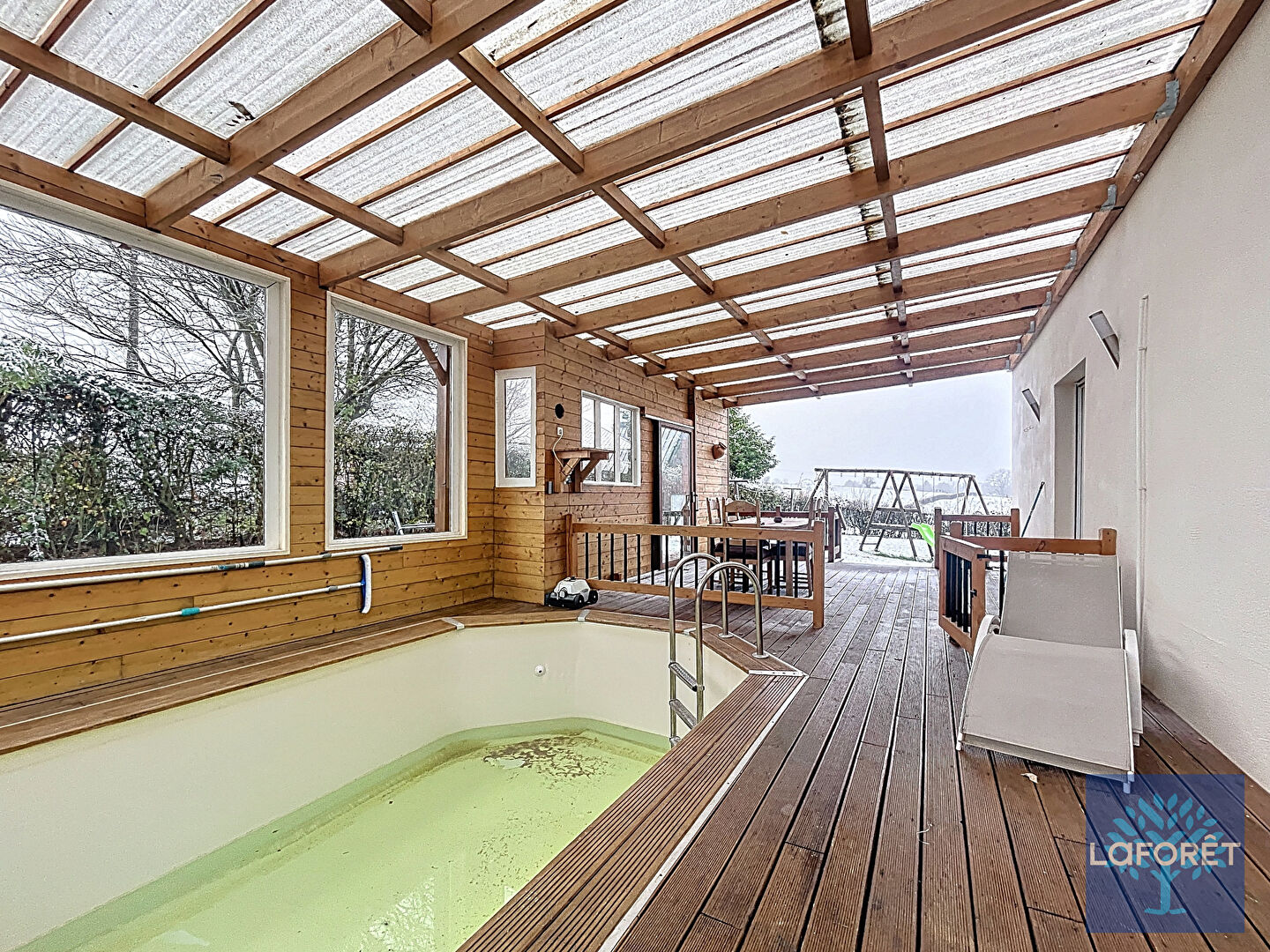 Extension bois avec piscine chauffée reliée à la pompe à chaleur : un véritable espace bien-être à domicile.