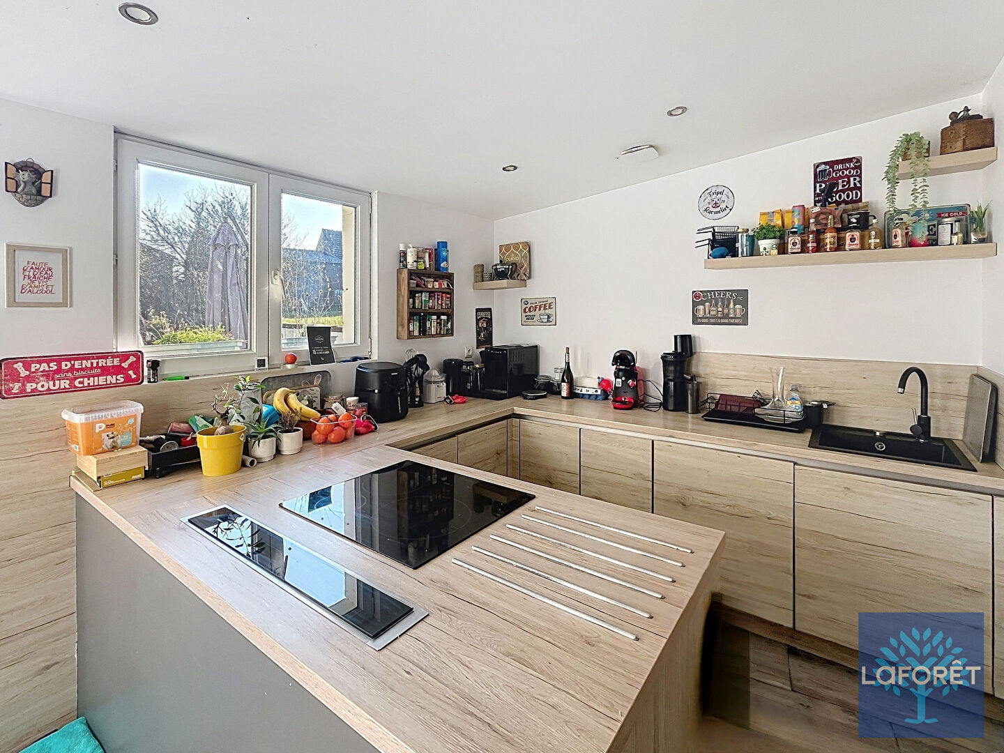 La cuisine équipée, fonctionnelle et pratique, est dotée de meubles de rangement, d'un lave-vaisselle, d'un four et d'un micro-ondes, complétée par une pièce de rangement.