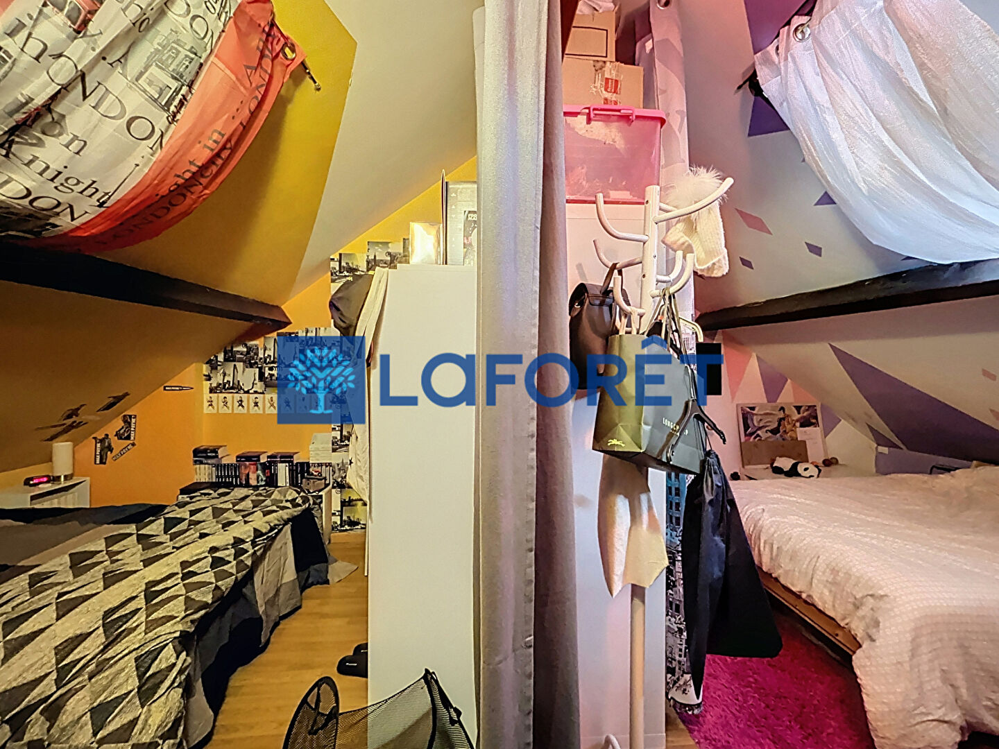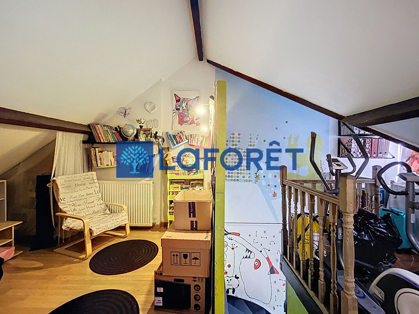 Dans les combles, un premier espace pouvant servir de salle de jeu ou bibliothèque, donnant sur une chambre mansardée (divisible en 2 coins nuits).