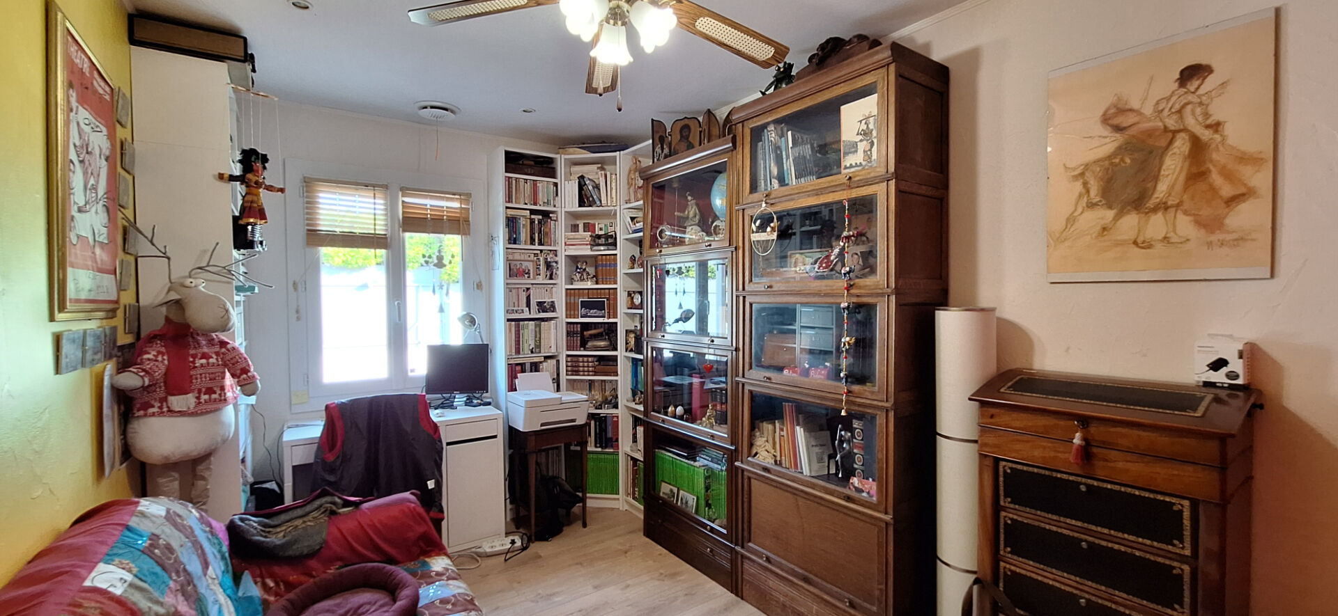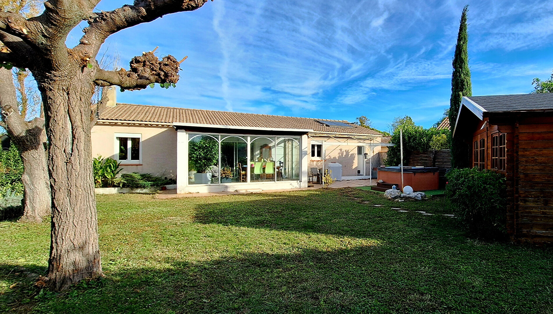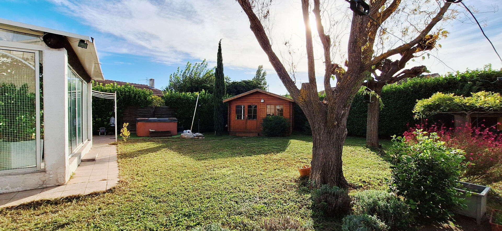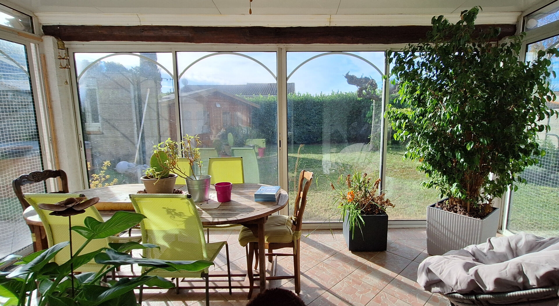 La véranda s'ouvre plein sud sur un jardin au calme et sans vis-à-vis, agrémenté d'un chalet de 15 m² climatisé, d'un spa et de plusieurs cabanons de jardin.