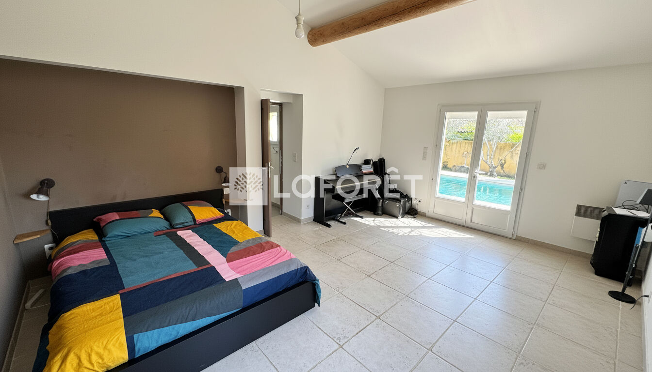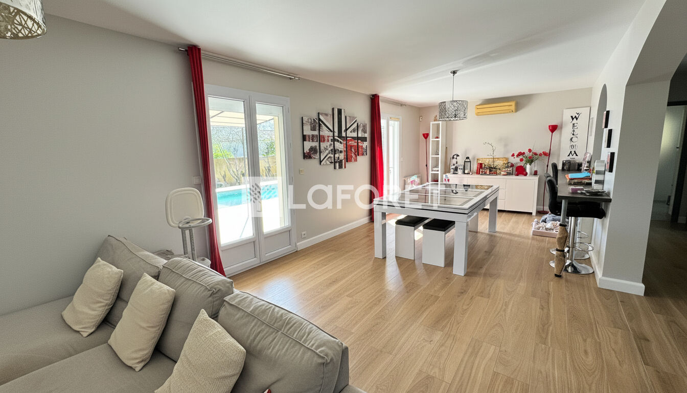 Ce bien propose également un grand garage double voiture de 50 m2, une piscine Desjoyaux, un forage, un arrosage intégré.