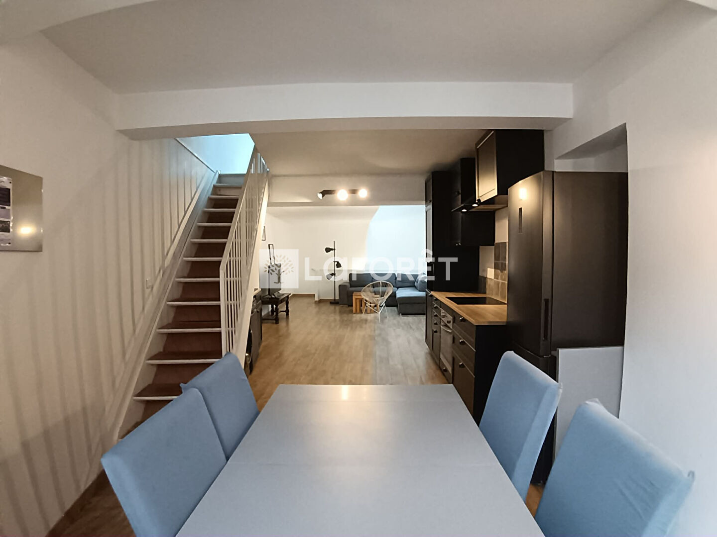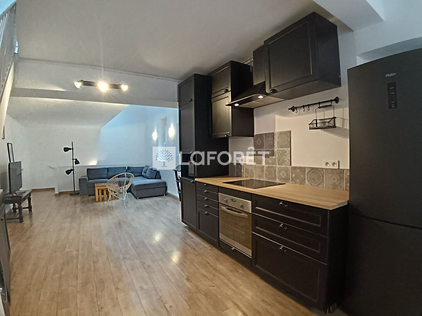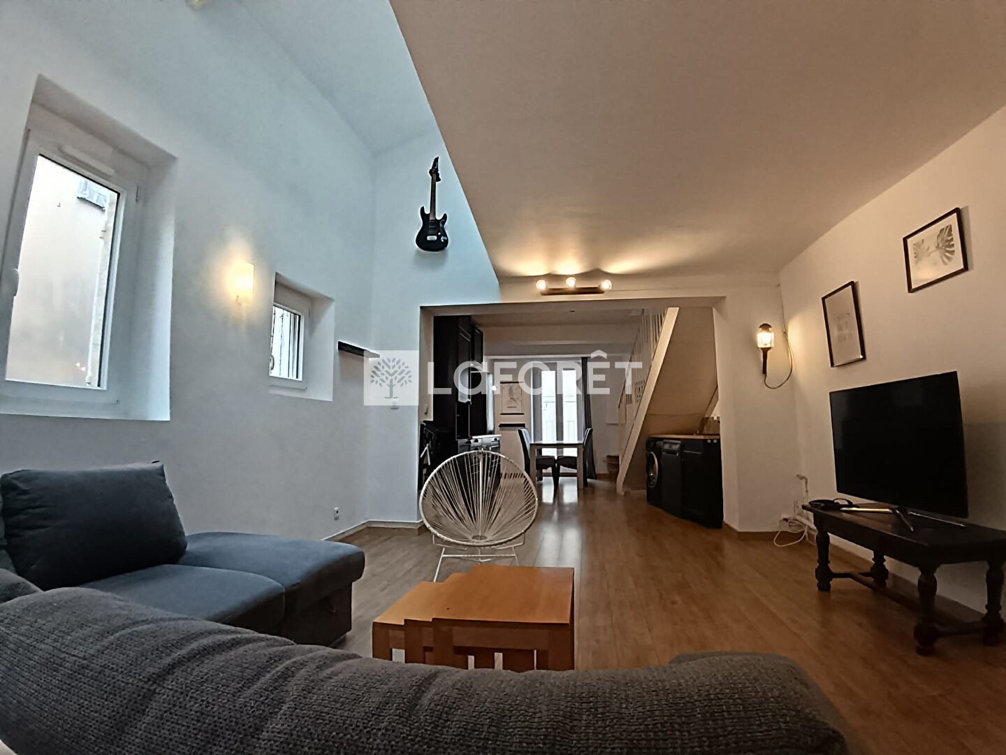 Au 1er étage : Laissez-vous séduire par une vaste pièce de vie baignée de lumière. Vous profiterez d'une belle hauteur sous plafond et d'une cuisine ouverte entièrement équipée.
