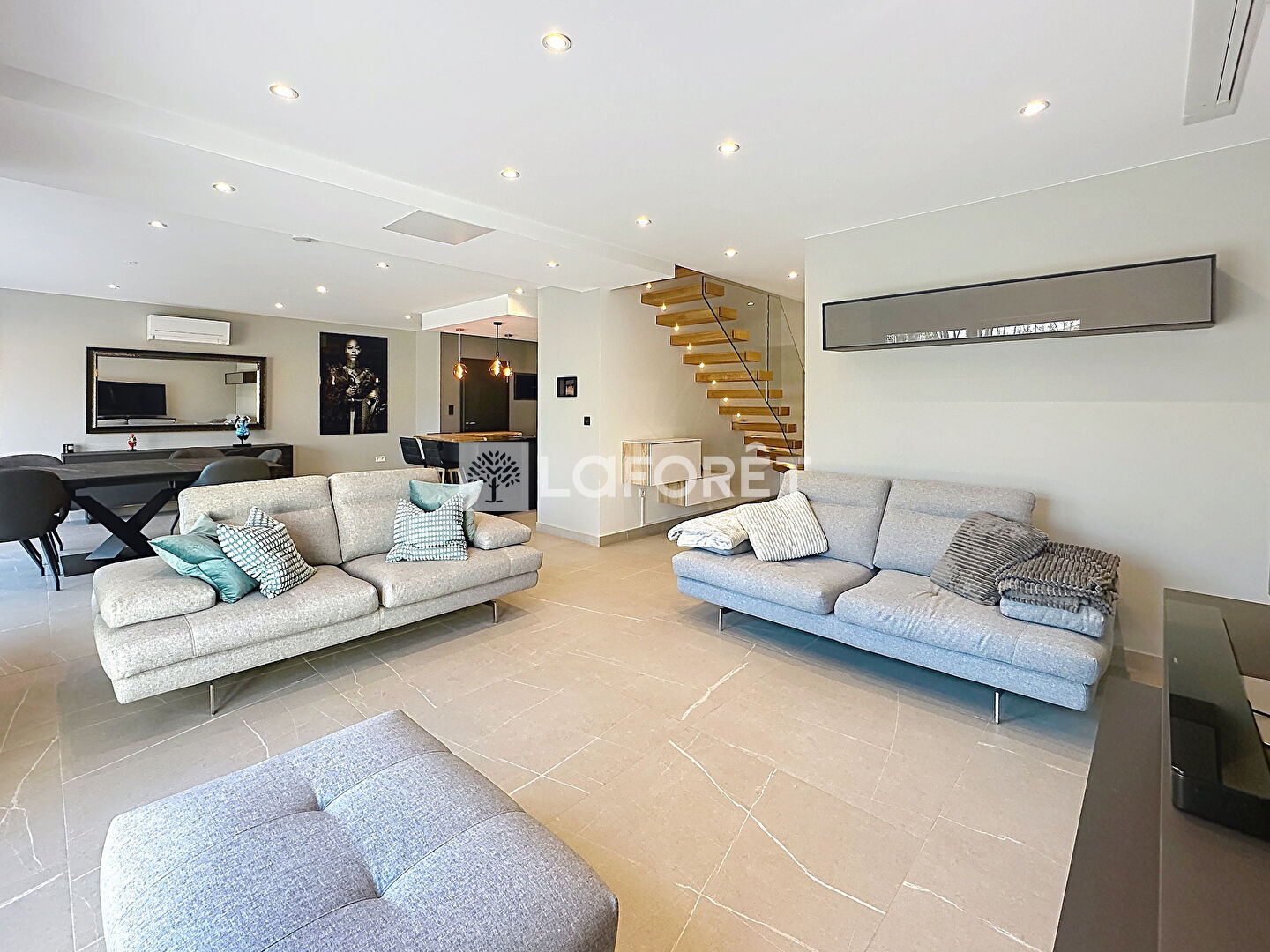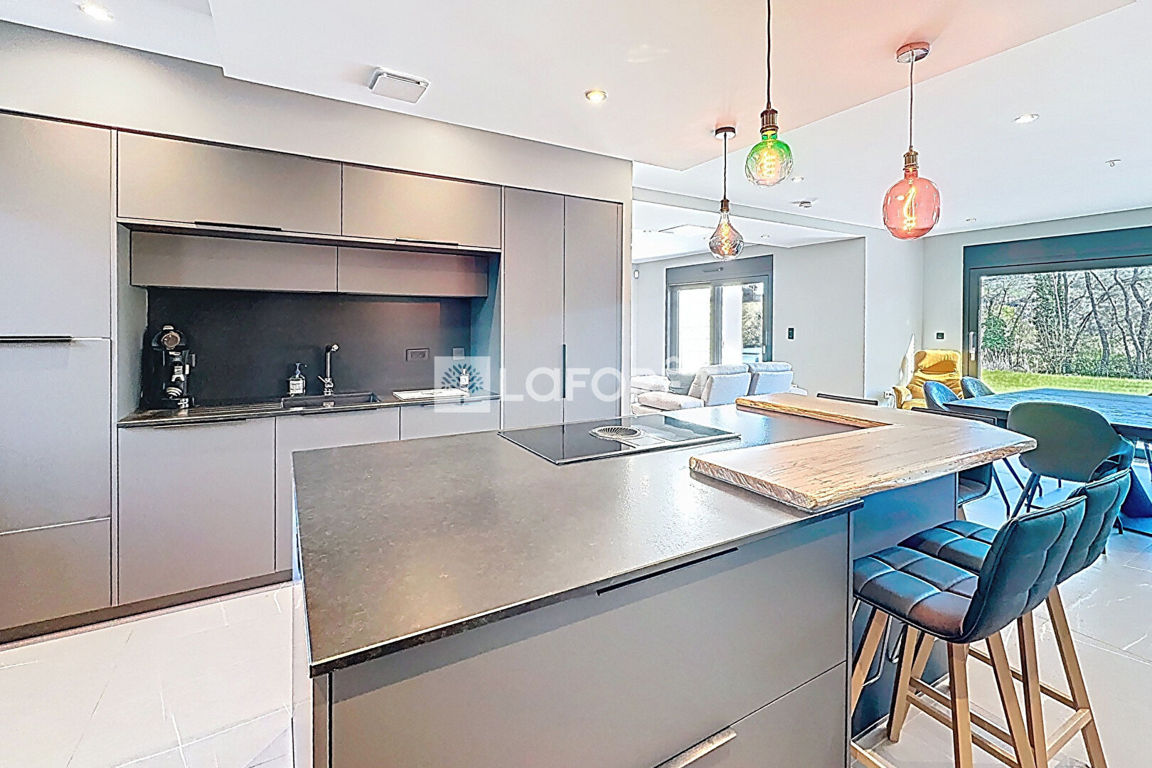 Dès l'entrée, vous découvrirez une spacieuse pièce de vie de 60 m², baignée de lumière, avec un accès direct à une grande terrasse et au jardin, idéal pour profiter pleinement de l'extérieur. La cuisine dispose d'un équipement haut de gamme avec plaque à induction avec hotte aspirante, double four et cave à vin.