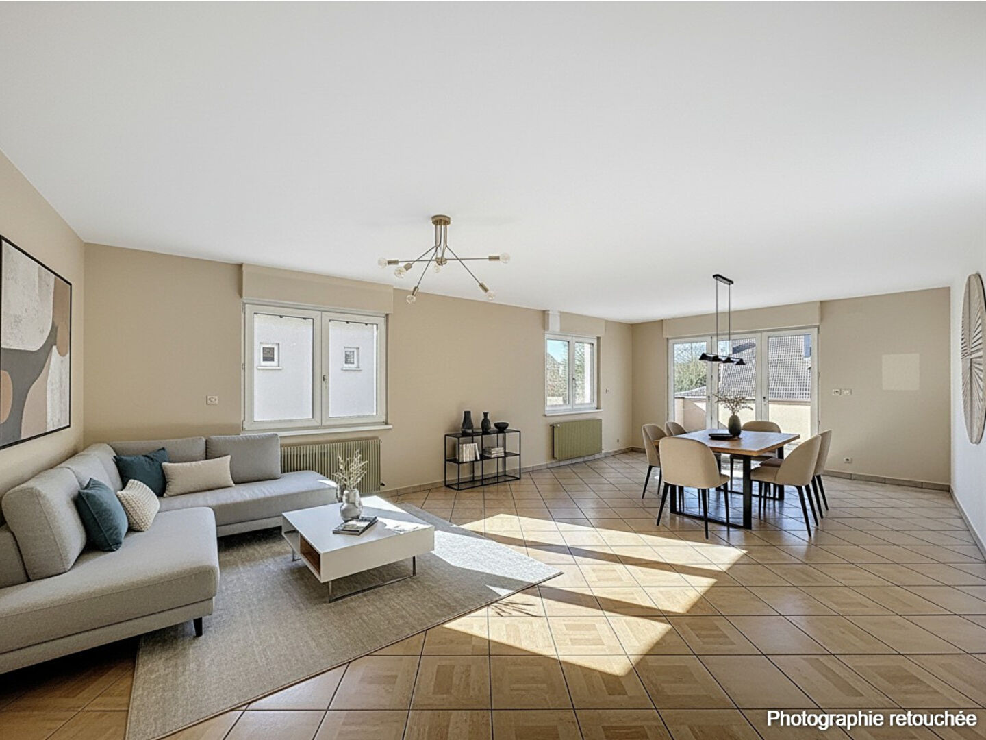 Dès l'entrée, vous serez séduit par les volumes et la luminosité des pièces. La maison dispose d'une entrée accueillante, d'un grand salon séjour de 34 m² avec la possibilité de l'ouvrir sur la cuisine de 15 m² . Le salon et la cuisine donnent directement accès à une grande terrasse de 30 m2 orientée sud ouest, donnant à son tour accès au jardin, parfaitement entretenu et longé par le Muehlbach.