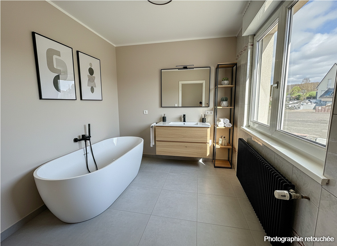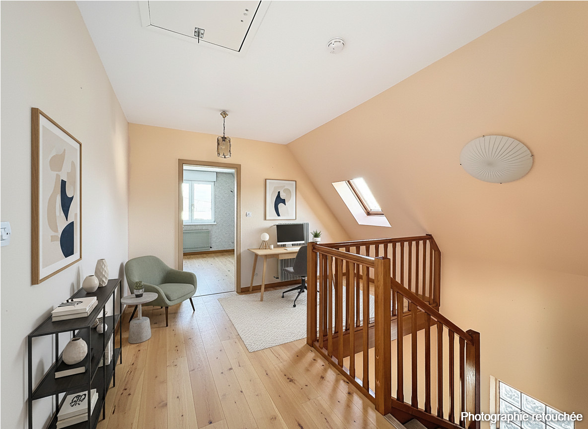 À l'étage, vous trouverez une mezzanine avec un espace bureau desservant 3 grandes chambres, dont une de 26 m² avec point d'eau, idéale pour une suite parentale ou un espace indépendant. Une salle d'eau avec un espace buanderie ainsi qu'un WC indépendant complètent ce niveau.