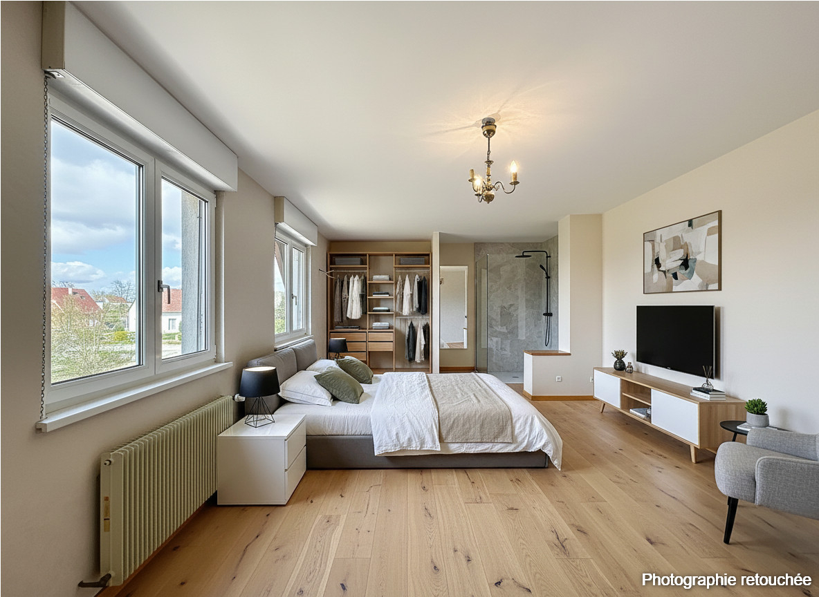 Le rez-de-chaussée comprend également une chambre avec un grand dressing sur mesure, une salle de bain et un WC indépendant, offrant un confort de vie appréciable au quotidien.
