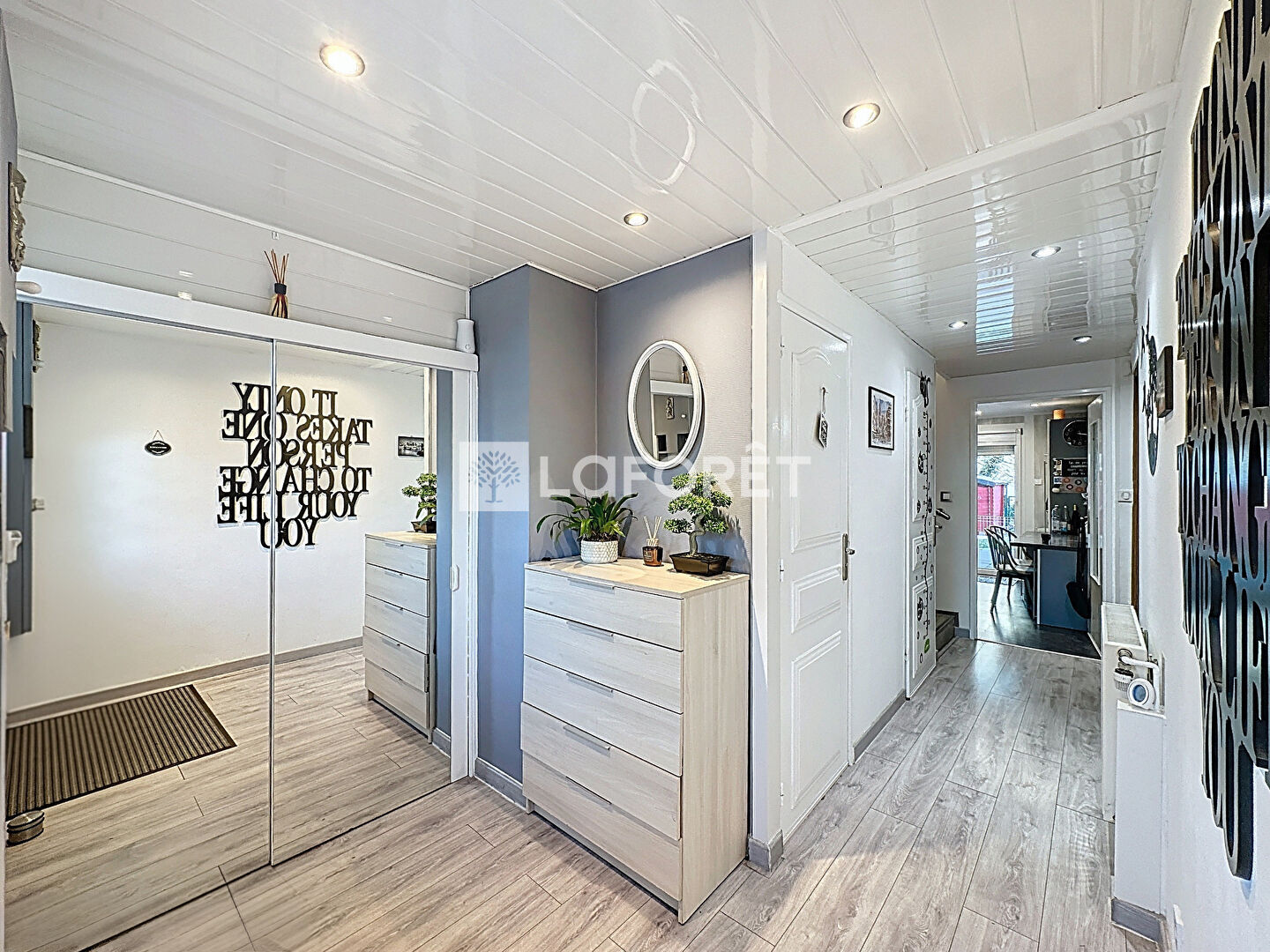 Une entrée avec grand dressing dessert une pièce de vie traversante de plus de 31 m², lumineuse et conviviale, ouverte sur la véranda et la piscine.