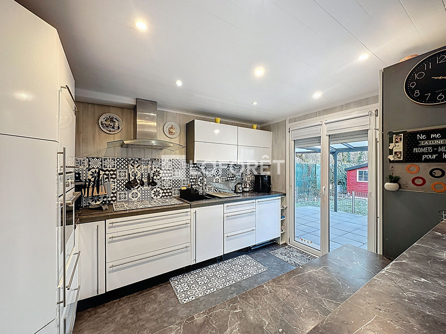 Elle comprend également une cuisine équipée, avec accès direct à la terrasse et à la pergola, une salle d'eau avec douche et WC, ainsi qu'un accès direct au garage, à la buanderie et au studio indépendant.