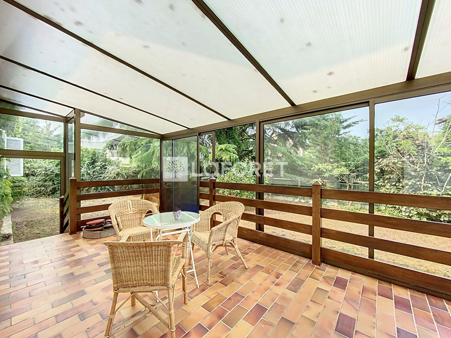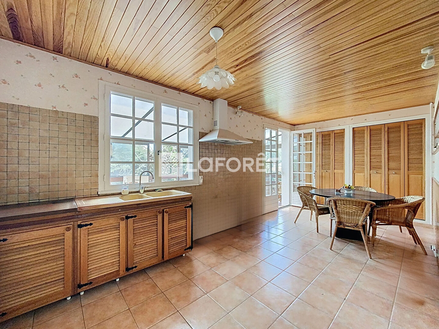 Une grande cuisine indépendante type family room donnant sur une terrasse abrité d'une véranda,