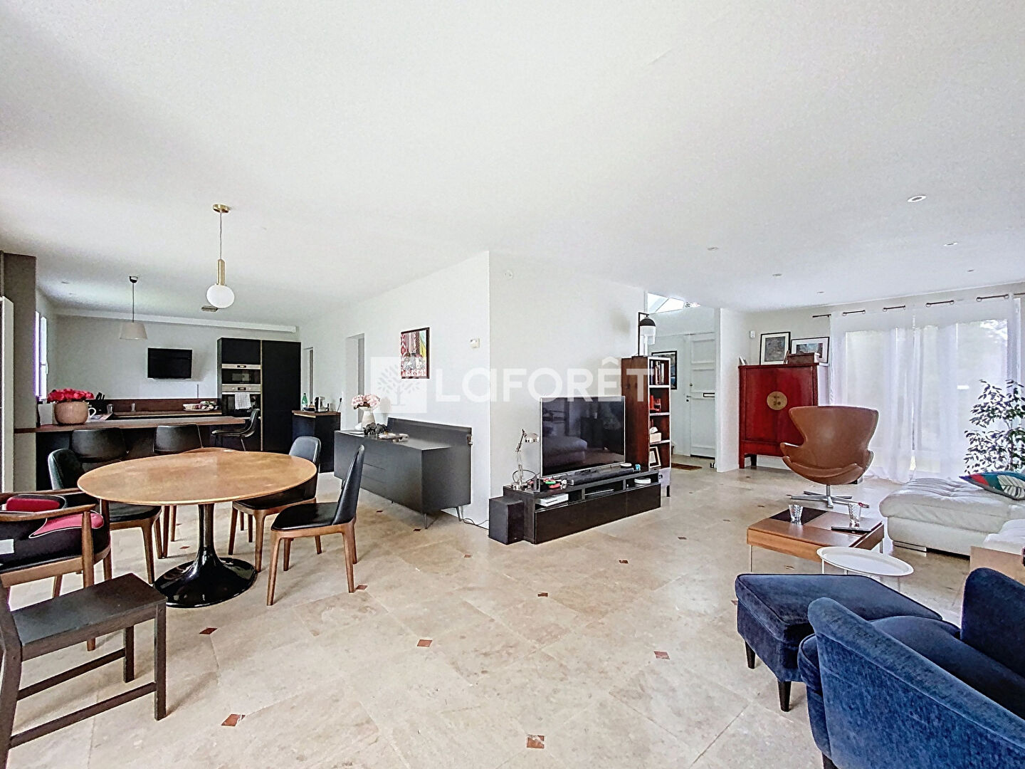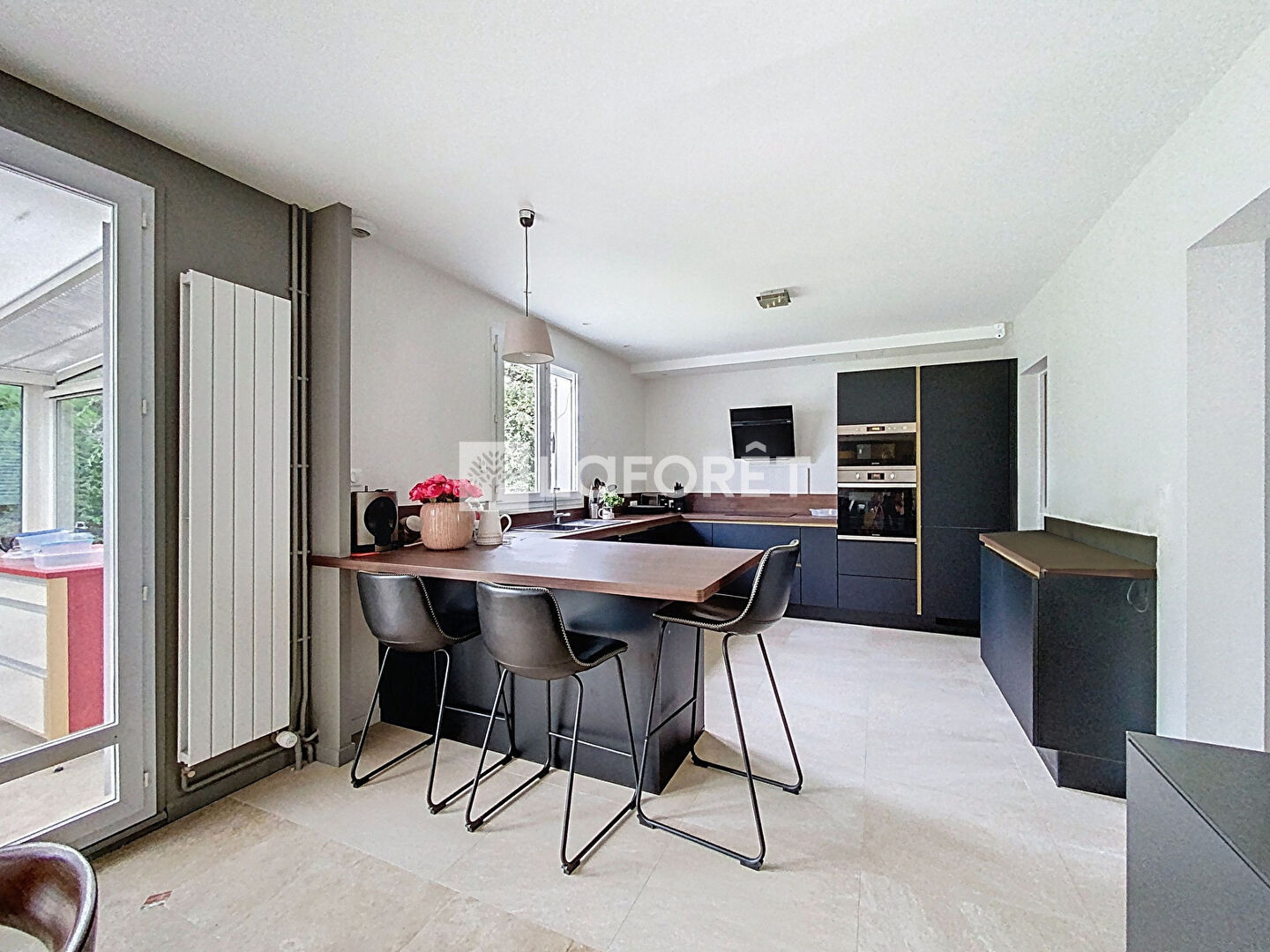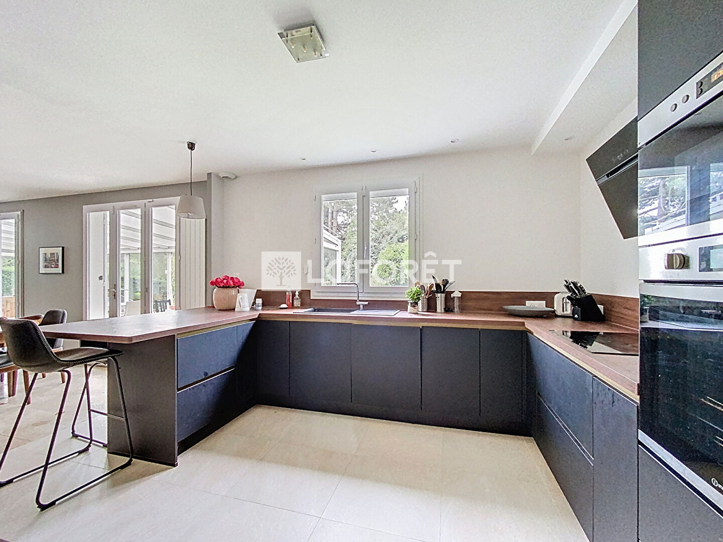 Une belle cuisine ouverte entièrement aménagée et équipée faisant parti du volume de la pièce de vie (65M²), une véranda attenante,