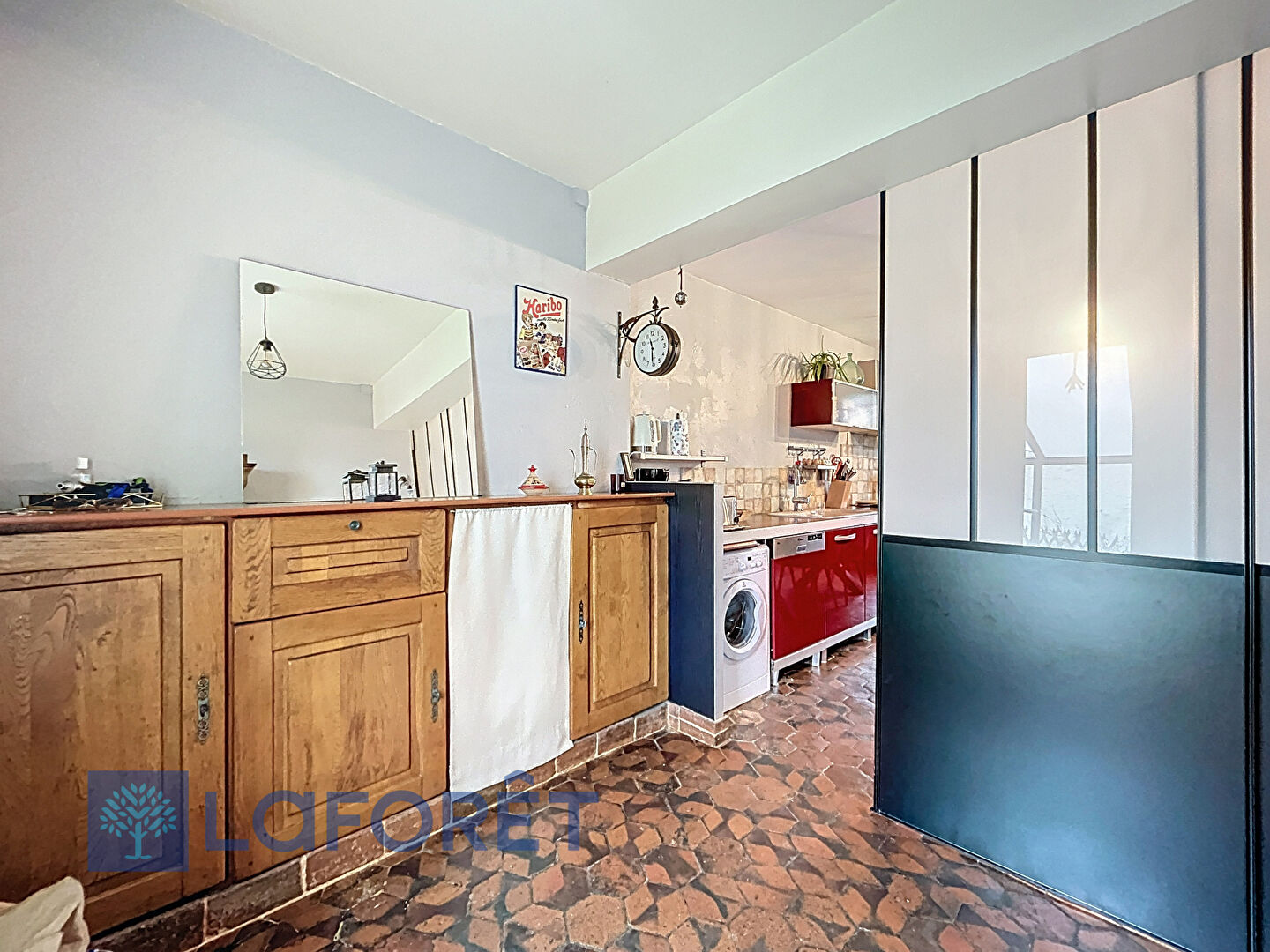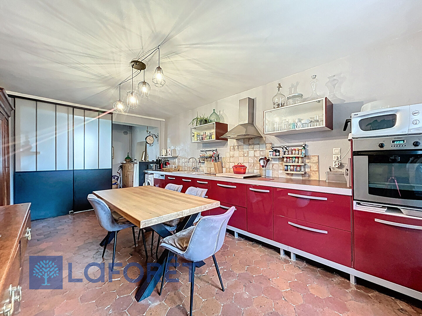 Une lumière traversante dans la cuisine, retrouvez tommette et cheminée.