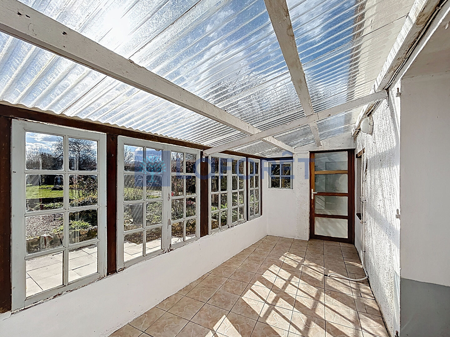 Grand salon séjour avec cheminée insert donnant sur une véranda lumineuse : un véritable jardin d'hiver pour profiter des saisons tout en étant à l'abri.
