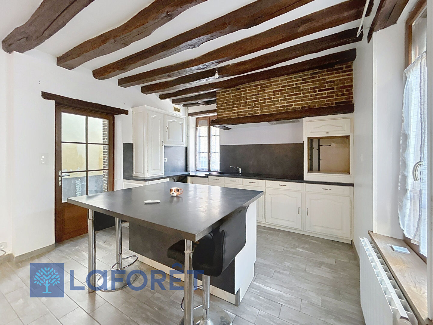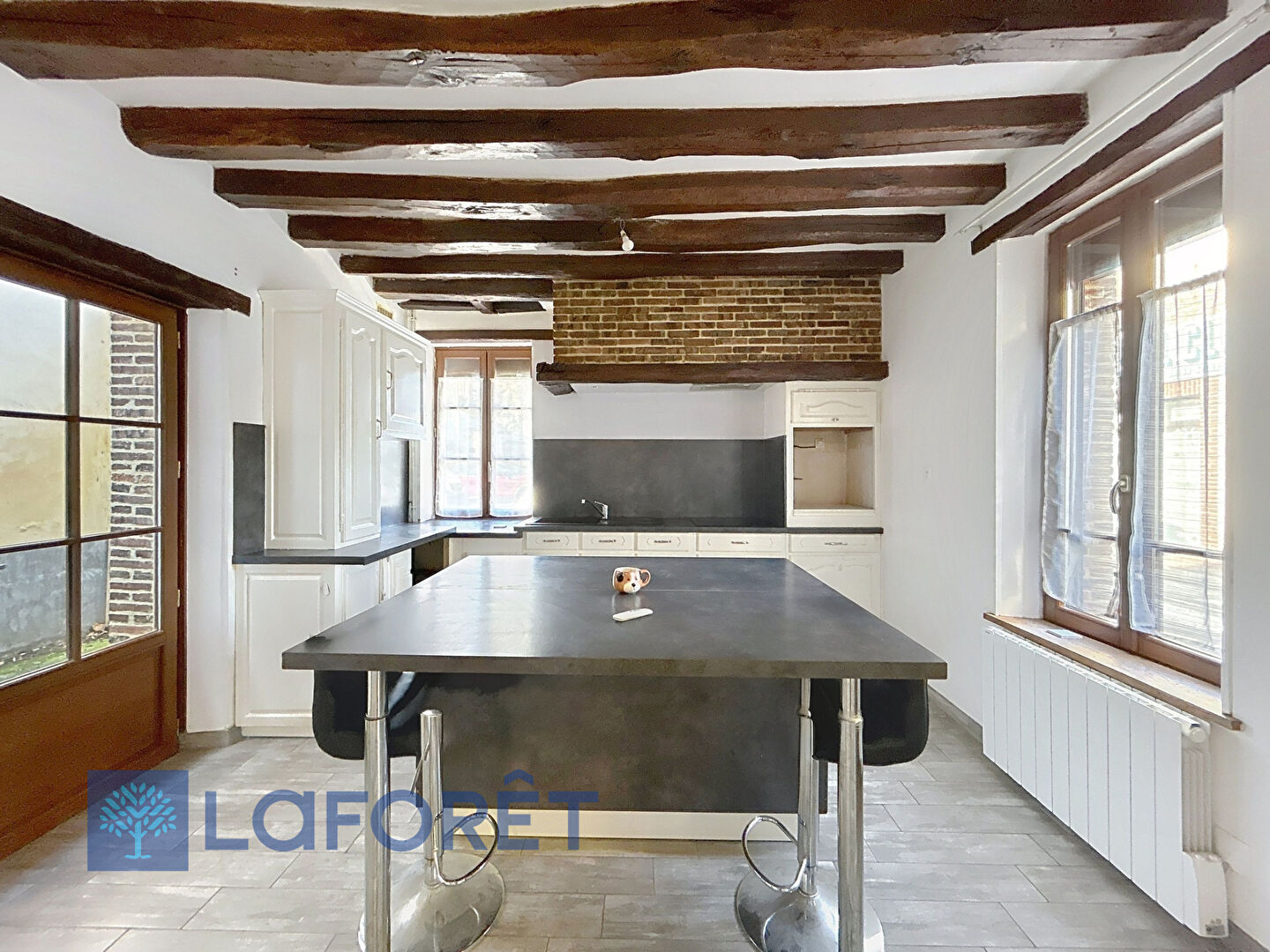 Matériaux anciens préservés : poutres apparentes, tommettes, charme des maisons normandes,