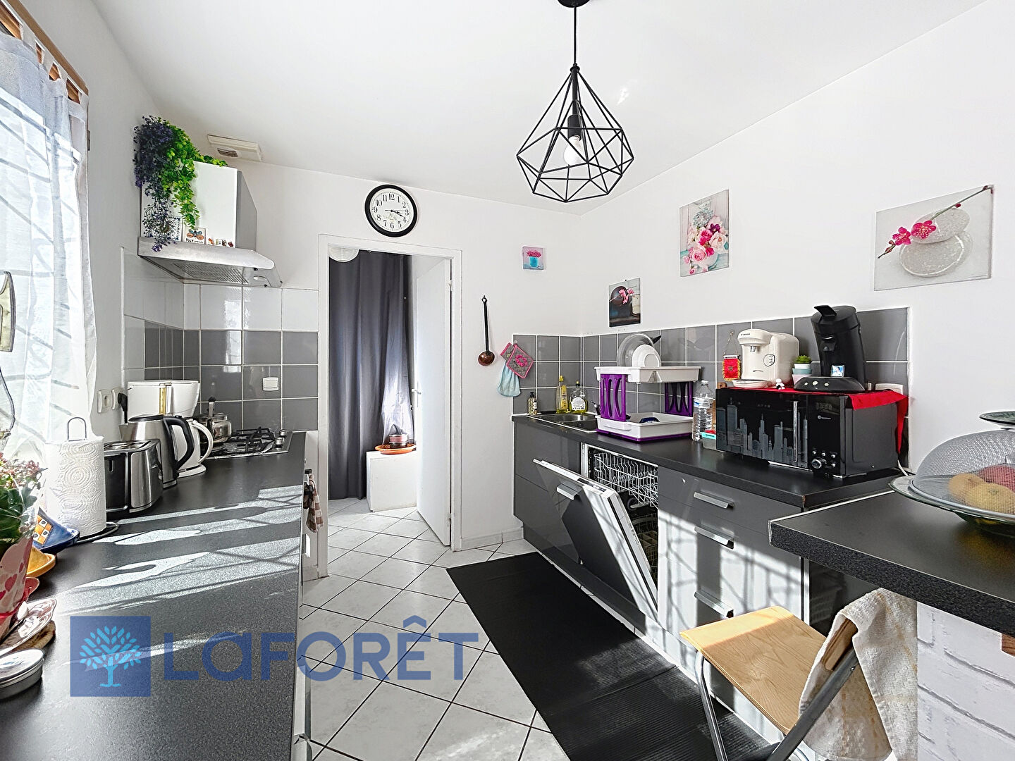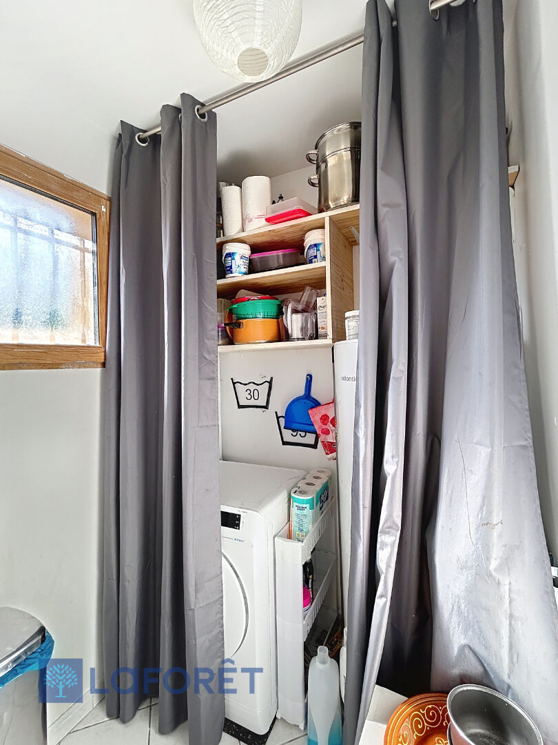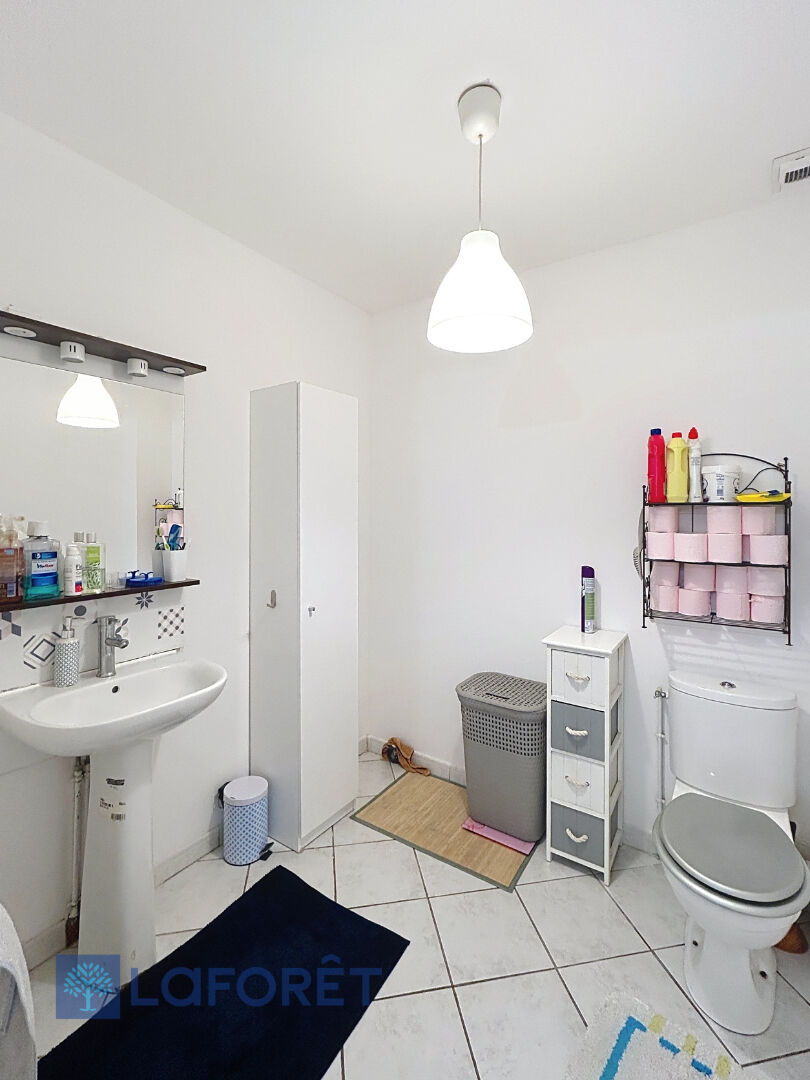 Séjour lumineux, cuisine équipée ouverte sur la salle à manger, WC.