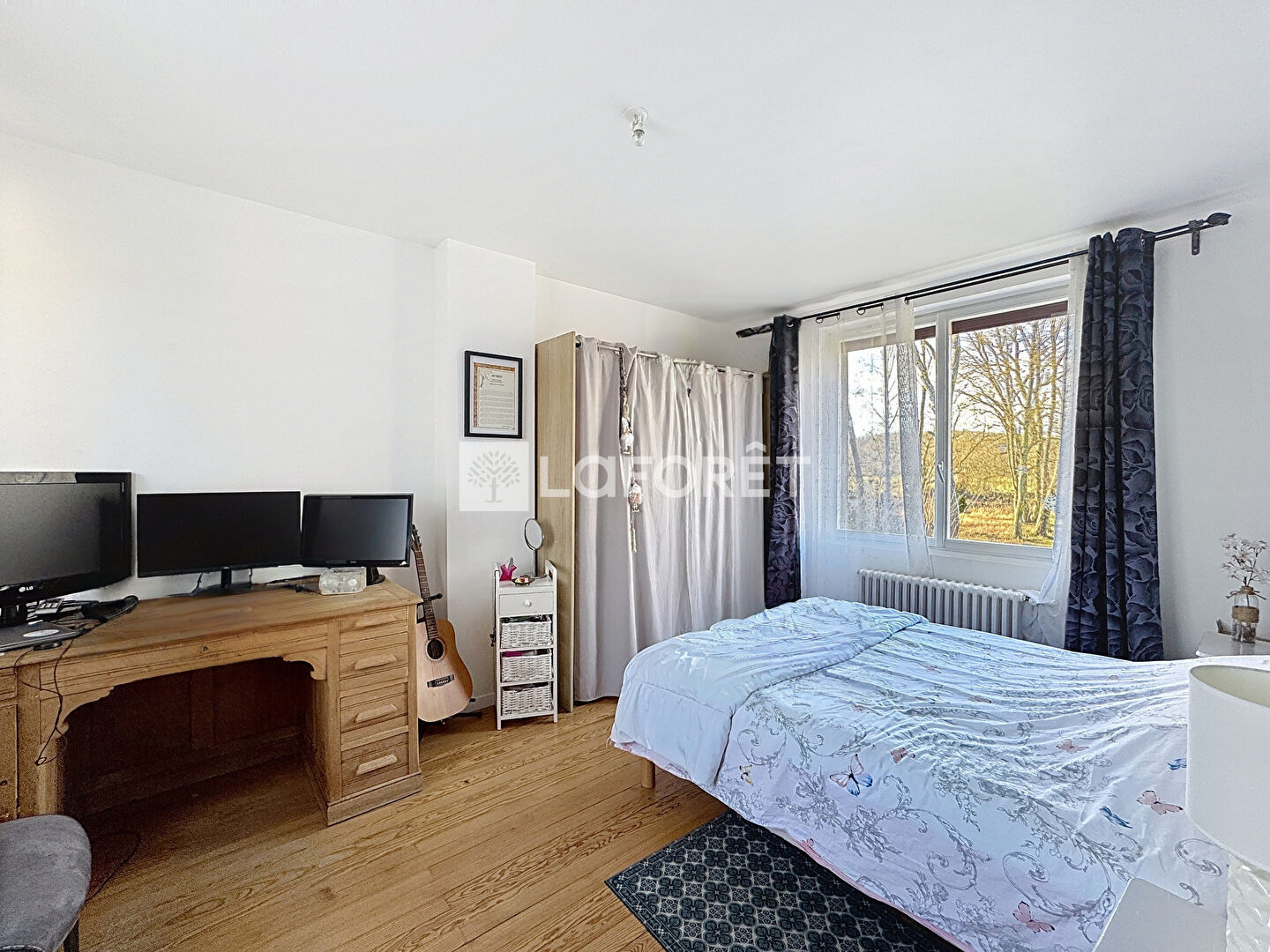 A l'étage le palier dessert deux vastes chambres, une salle de bains/ douche et un WC.