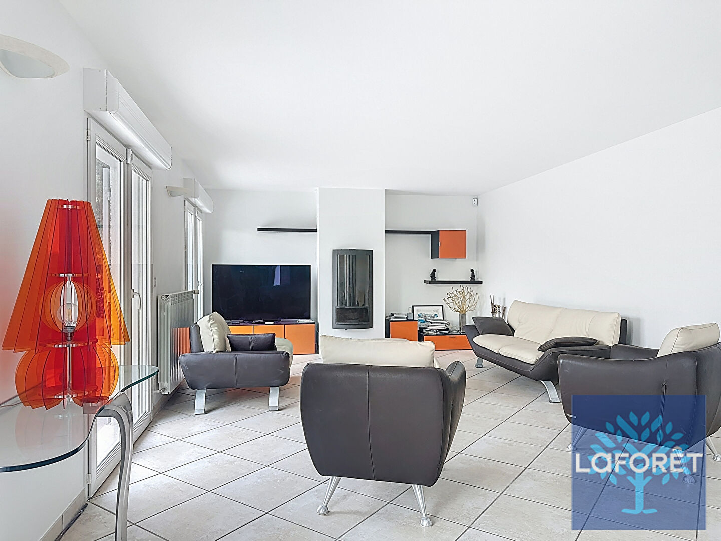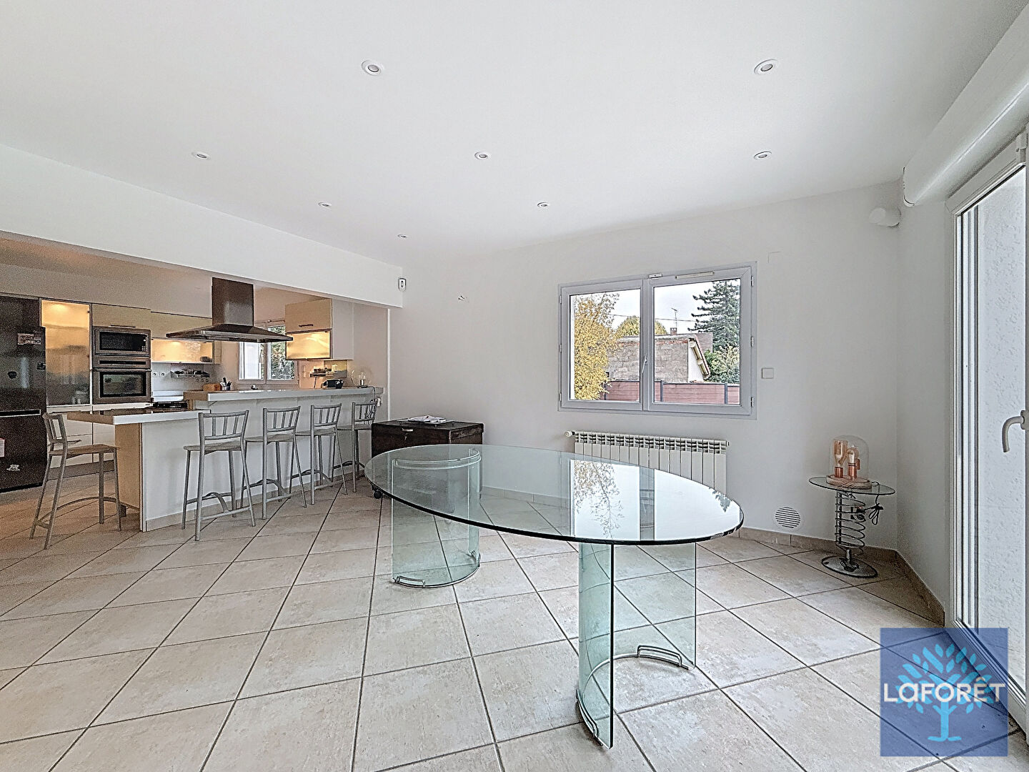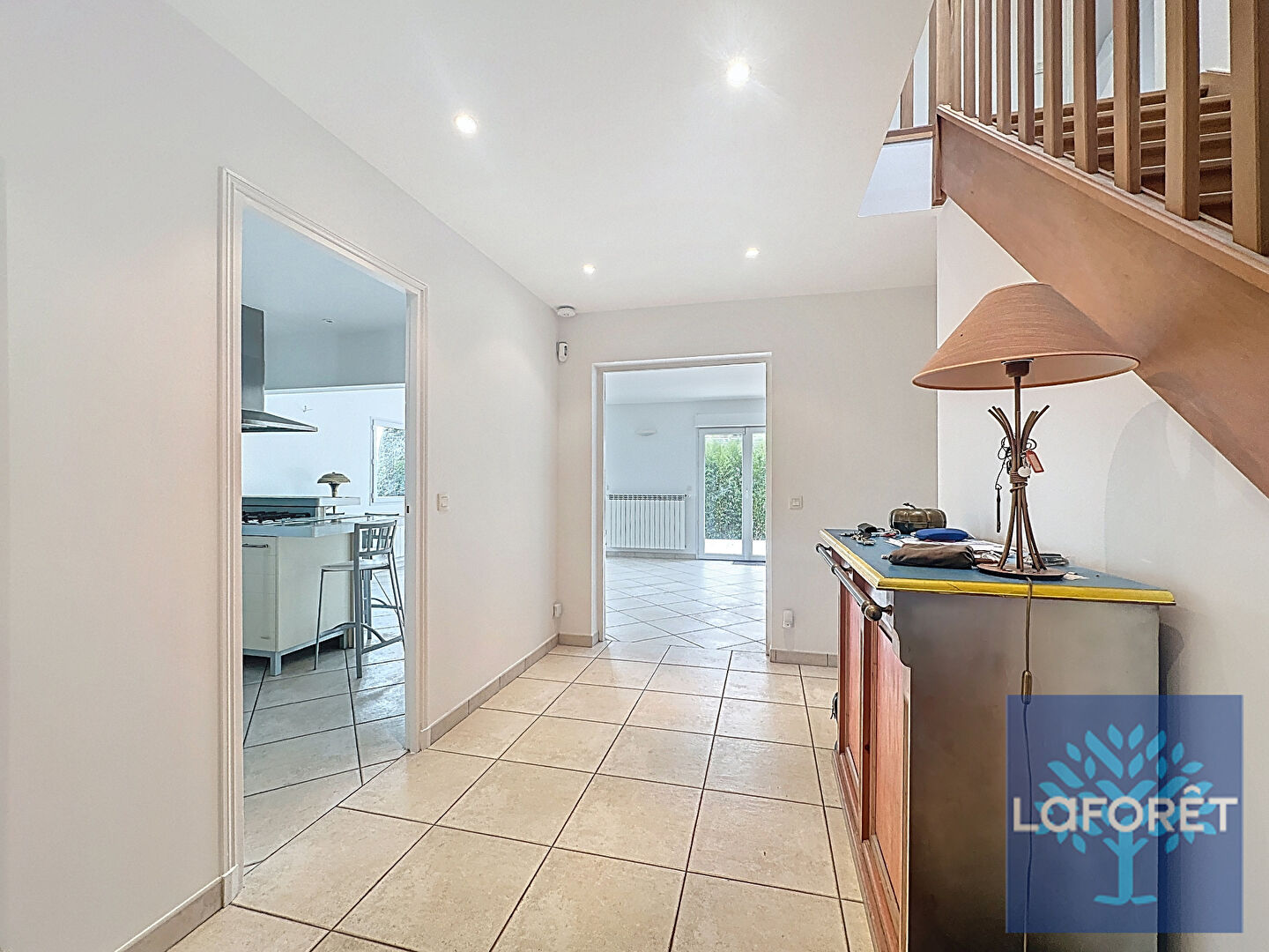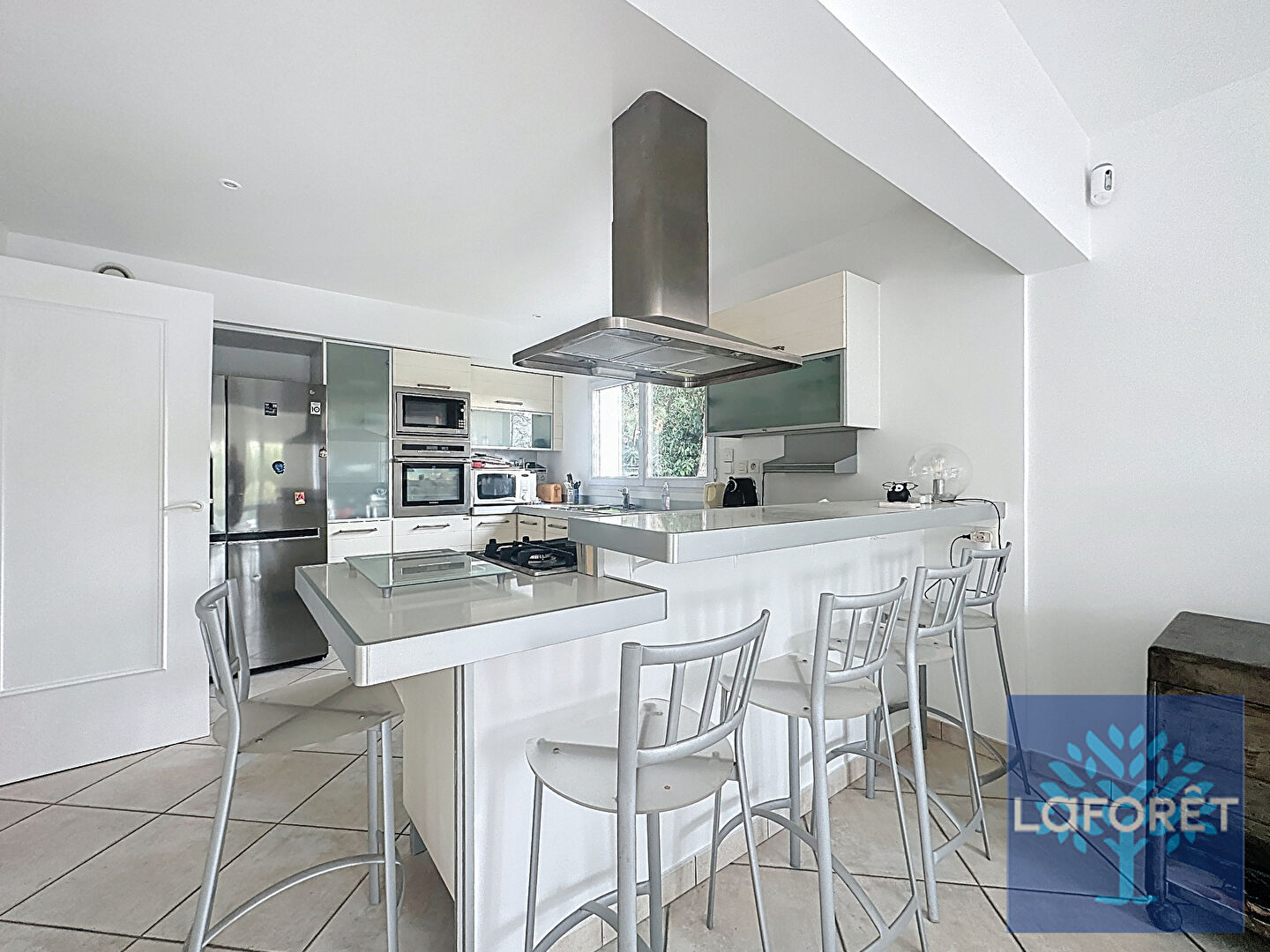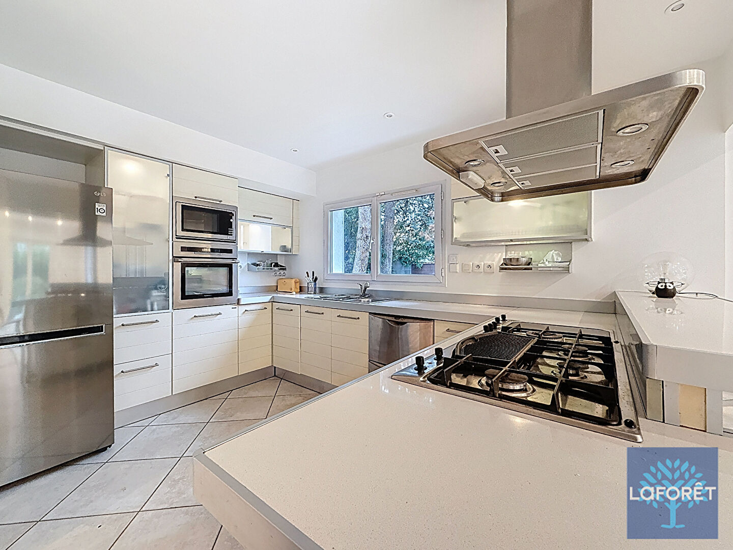 L'entrée de la maison s'ouvre sur un vaste séjour double de 55 m², baigné de lumière grâce à ses larges baies vitrées et sa double exposition, offrant un accès direct à la terrasse. La cuisine contemporaine, entièrement aménagée, dispose d'un espace bar convivial, idéal pour partager des moments en famille ou entre amis.