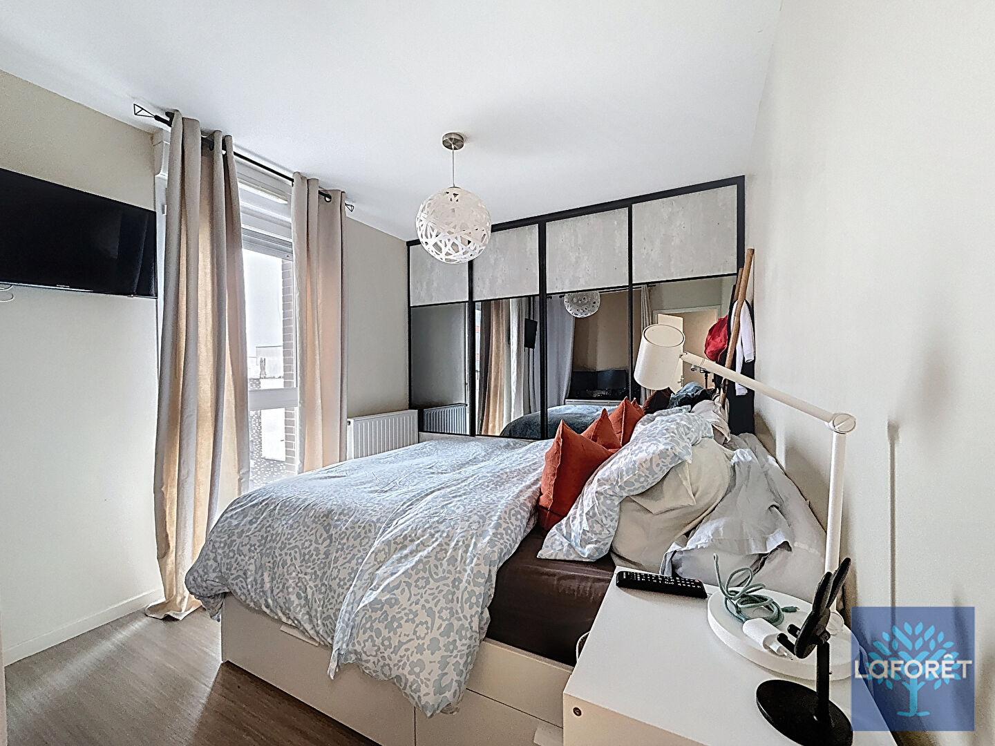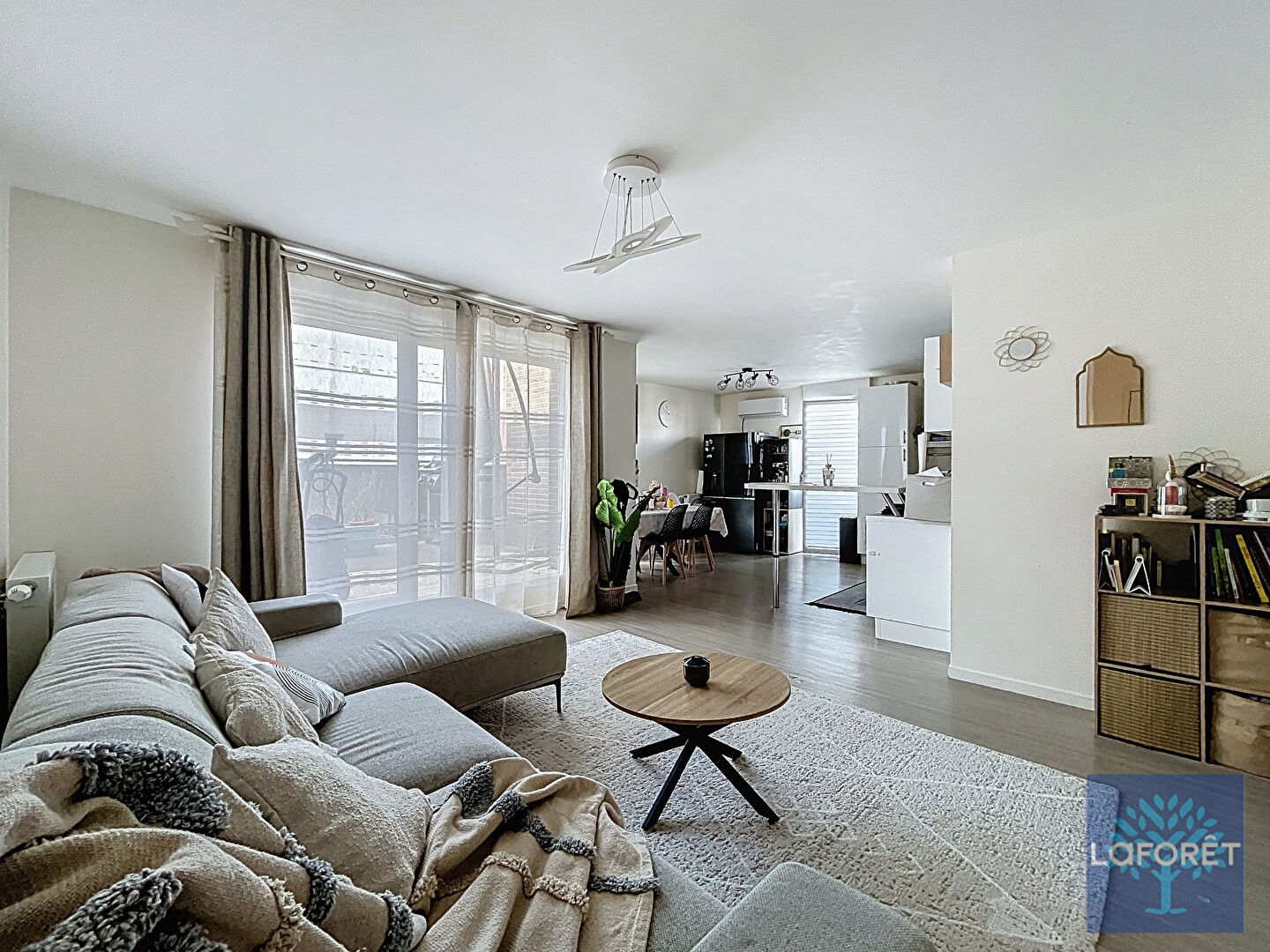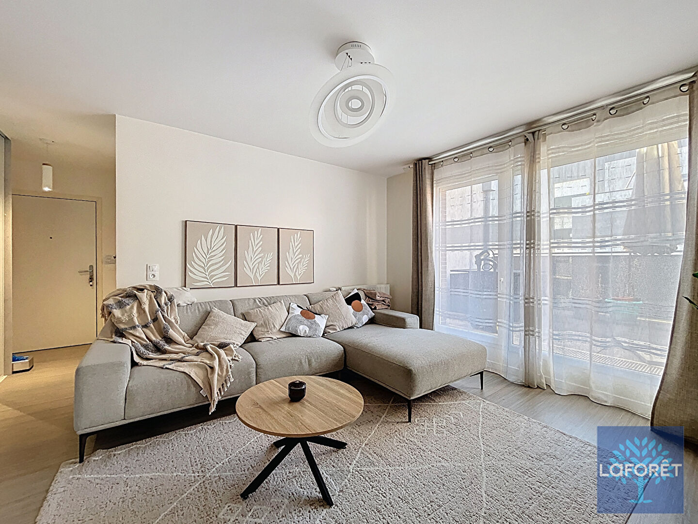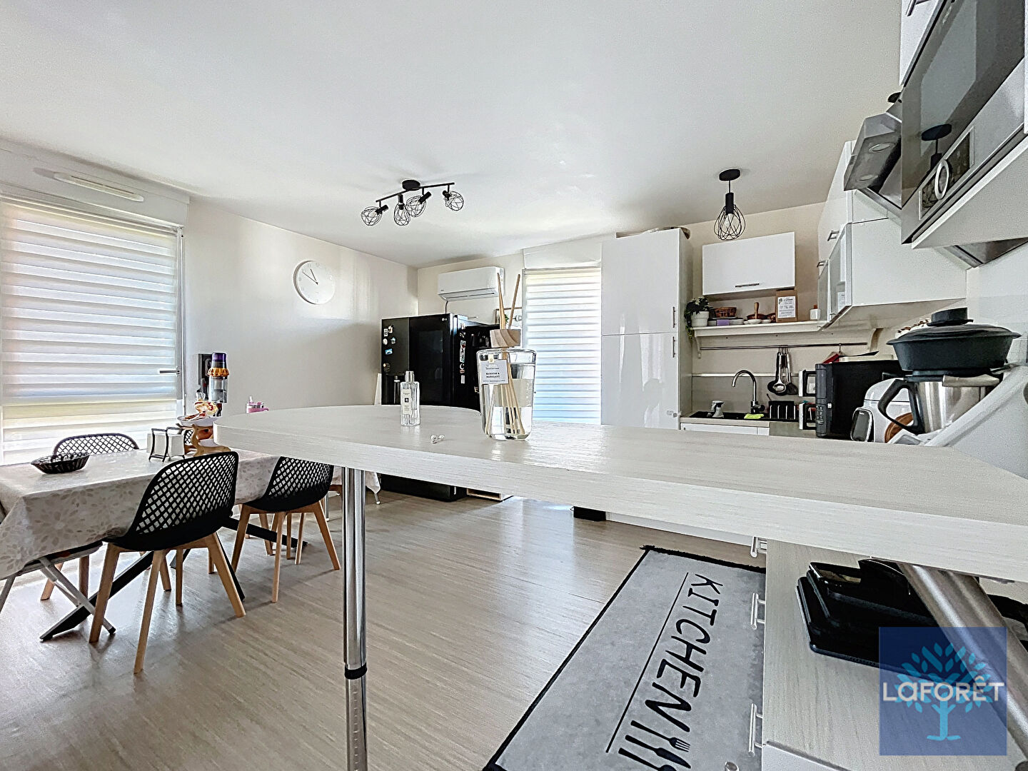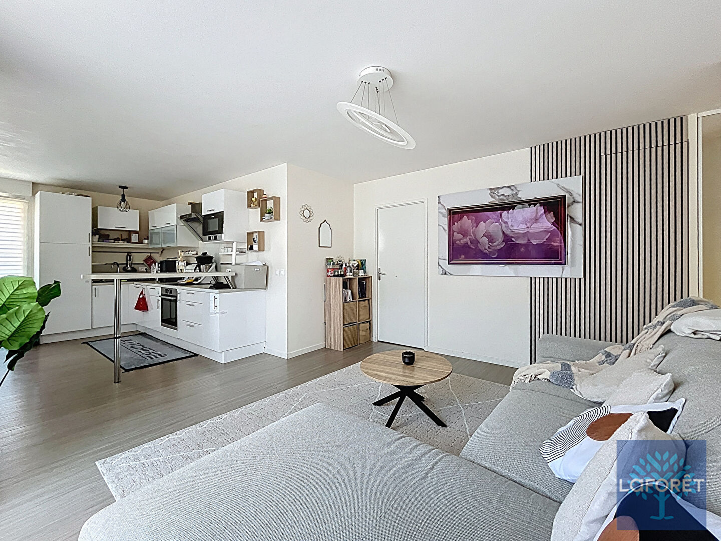 L'entrée, équipée de rangements, mène à un séjour spacieux et lumineux de plus de 36 m², comprenant salle à manger et cuisine ouverte, prolongé par une terrasse de 11 m² au calme.