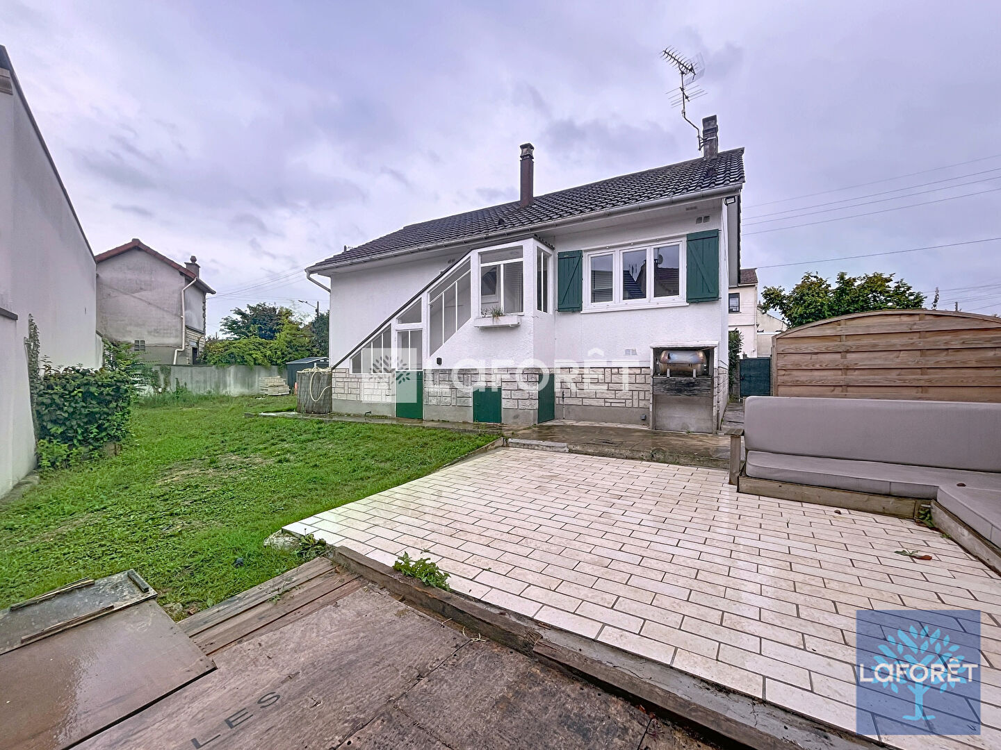 Enfin, le jardin, qui entoure le pavillon, dispose d'un coin terrasse idéal pour vos moments de détente en extérieur.