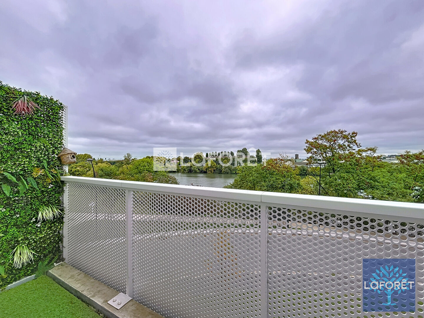 À l'étage, un palier baigné de lumière et ouvert sur la Seine dessert deux chambres, dont une avec vue directe sur le fleuve et l'autre équipée de rangements sur mesure. Une salle de bains avec WC vient parfaire ce niveau.