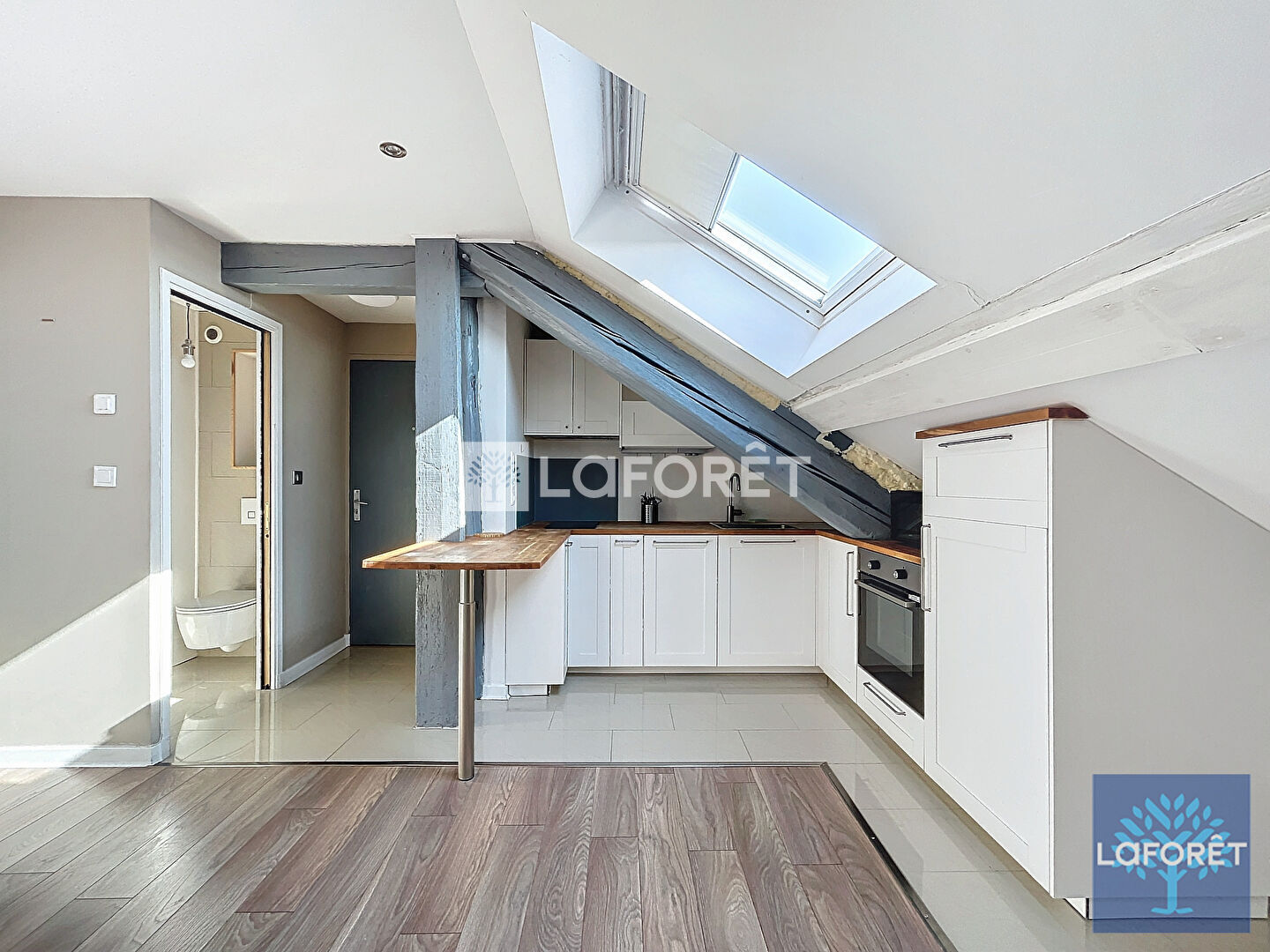 Atouts de ce deux pièces : la luminosité et le cachet avec ses poutres !