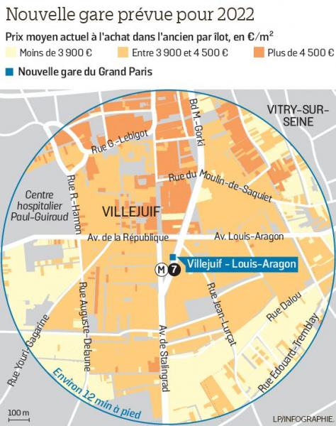 Du côté de la gare Villejuif-Louis-Aragon, où l'on se situe entre 4 000 euros le mètre carré pour de l'ancien et plus de 5 000 euros pour du neuf (par exemple un deux-pièces de 35 m²), «les prix vont avoir tendance à se rapprocher à moyen terme de ceux des quartiers populaires de Paris», commente Patrick Hebert, gérant Laforêt Immobilier, «tant Villejuif est une ville à fort potentiel»