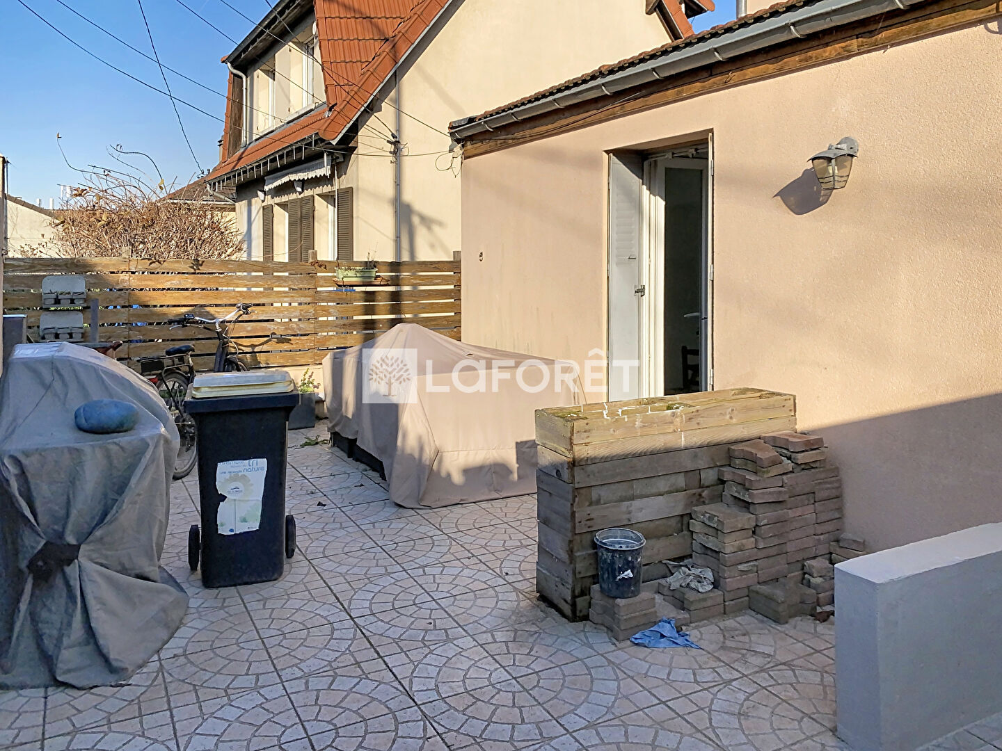 Espace terrasse à l'avant avec portail d'accès,