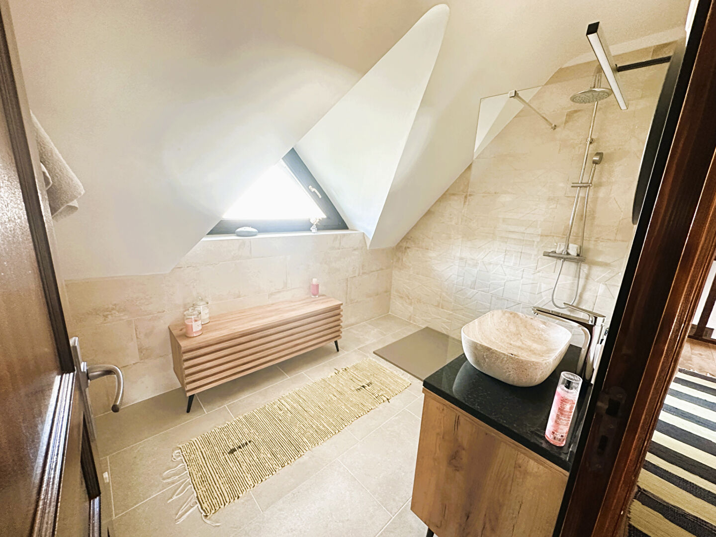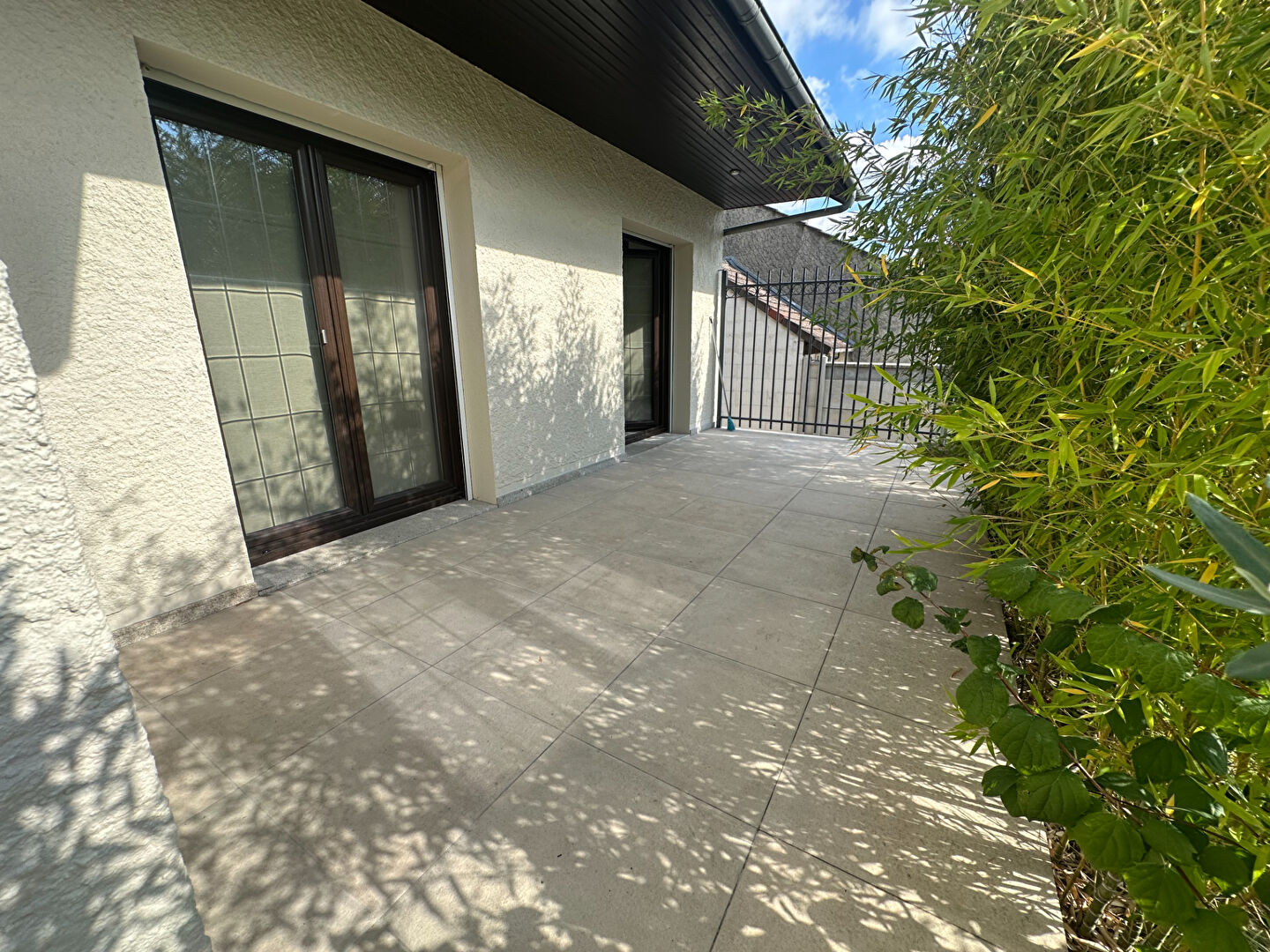 Au rez-de-chaussée : une entrée, un grand séjour lumineux avec cuisine ouverte aménagée donnant sur une grande terrasse, une chambre, un WC et une salle de bains.