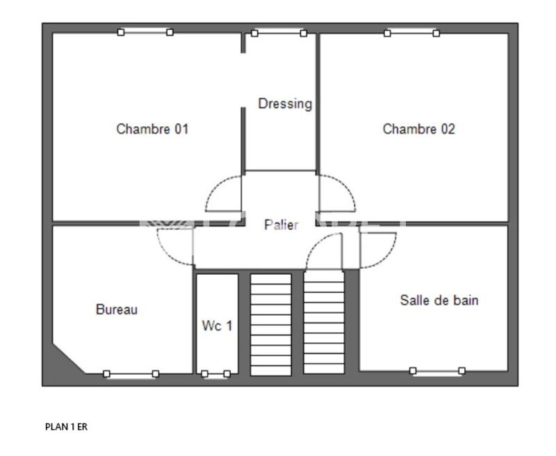 Au 1er étage, palier desservant 3 chambres dont une avec dressing privatif, salle de bains, WC séparés.