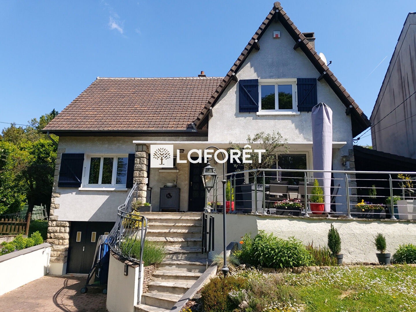 Maison INDEPENDANTE comprenant une entrée, séjour double TRAVERSANT expo E/O attenant à 2 belles TERRASSES, cuisine Us aménagée, 2 chambres, salle de bains et wc. A l'étage, 3 chambres, salle de bains, wc, combles en sous pente.