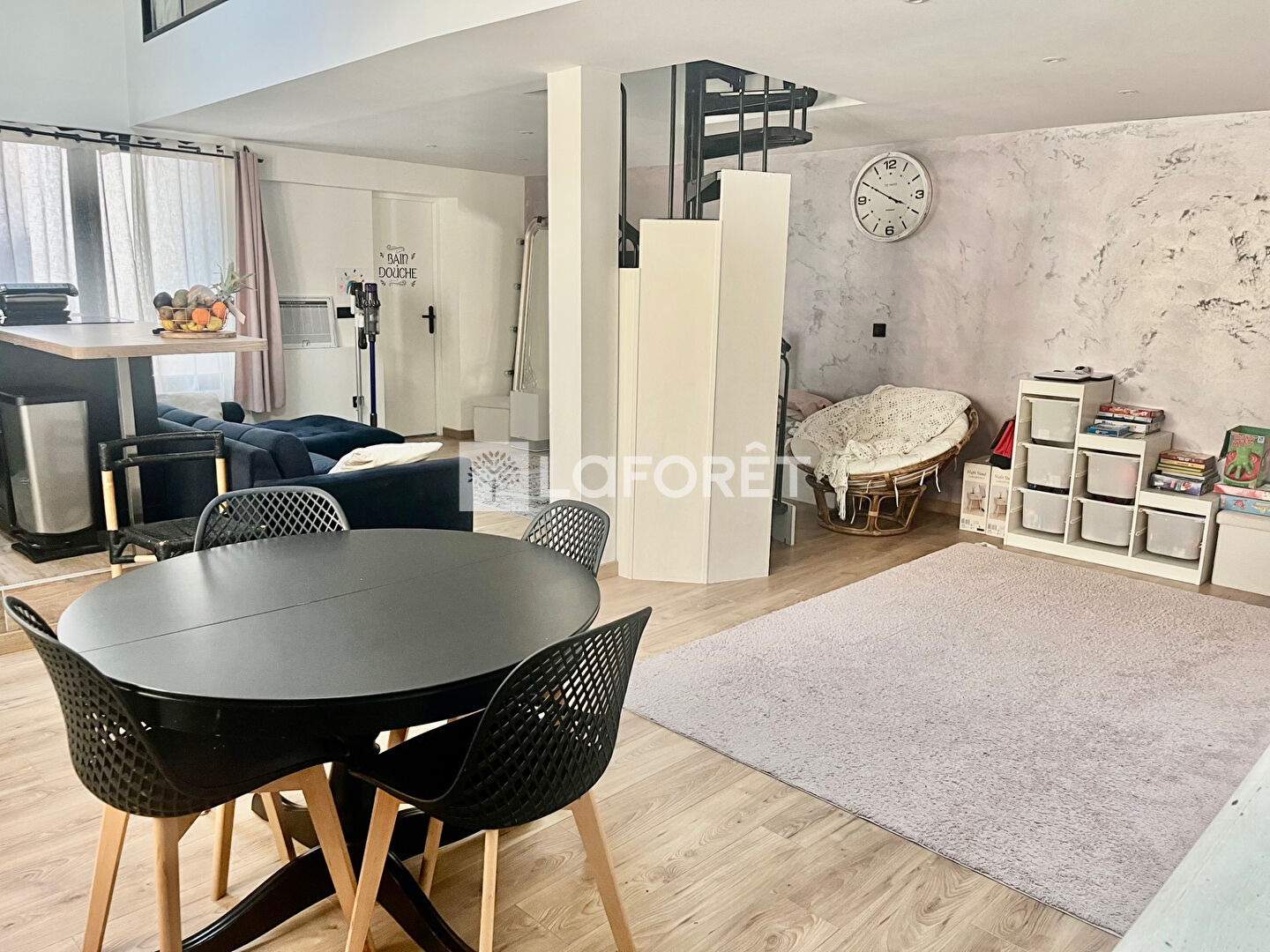 DUPLEX, style loft comprenant une pièce de vie de 45m2: salle a manger cuisine ouverte séjour, salle de bain et wc.