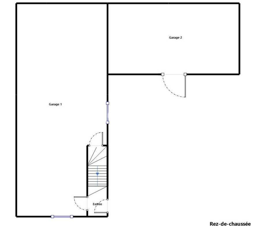 A gauche, GARAGE en rez de jardin. A l'étage, séjour, cuisine, sde+wc, chambre.