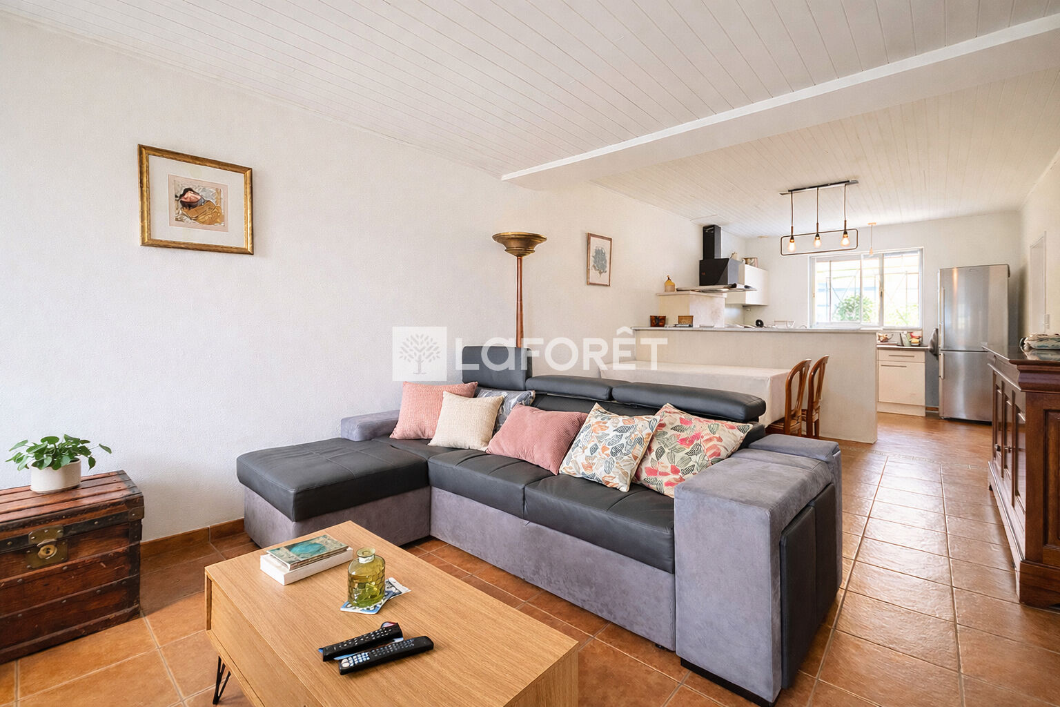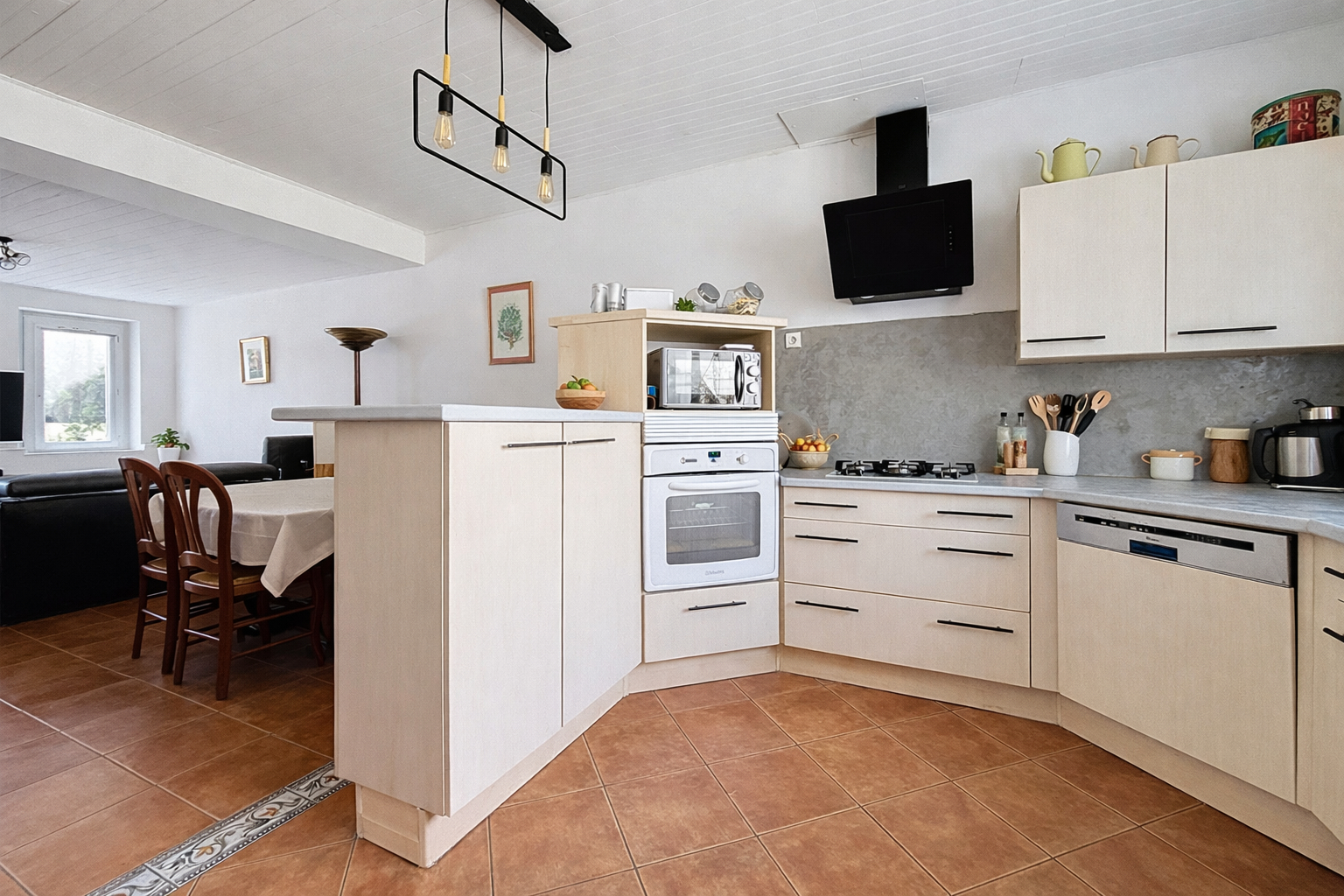 Le rez-de-chaussée offre un espace de vie convivial avec une cuisine ouverte sur le salon, une salle d'eau, une buanderie ainsi qu'une première chambre.