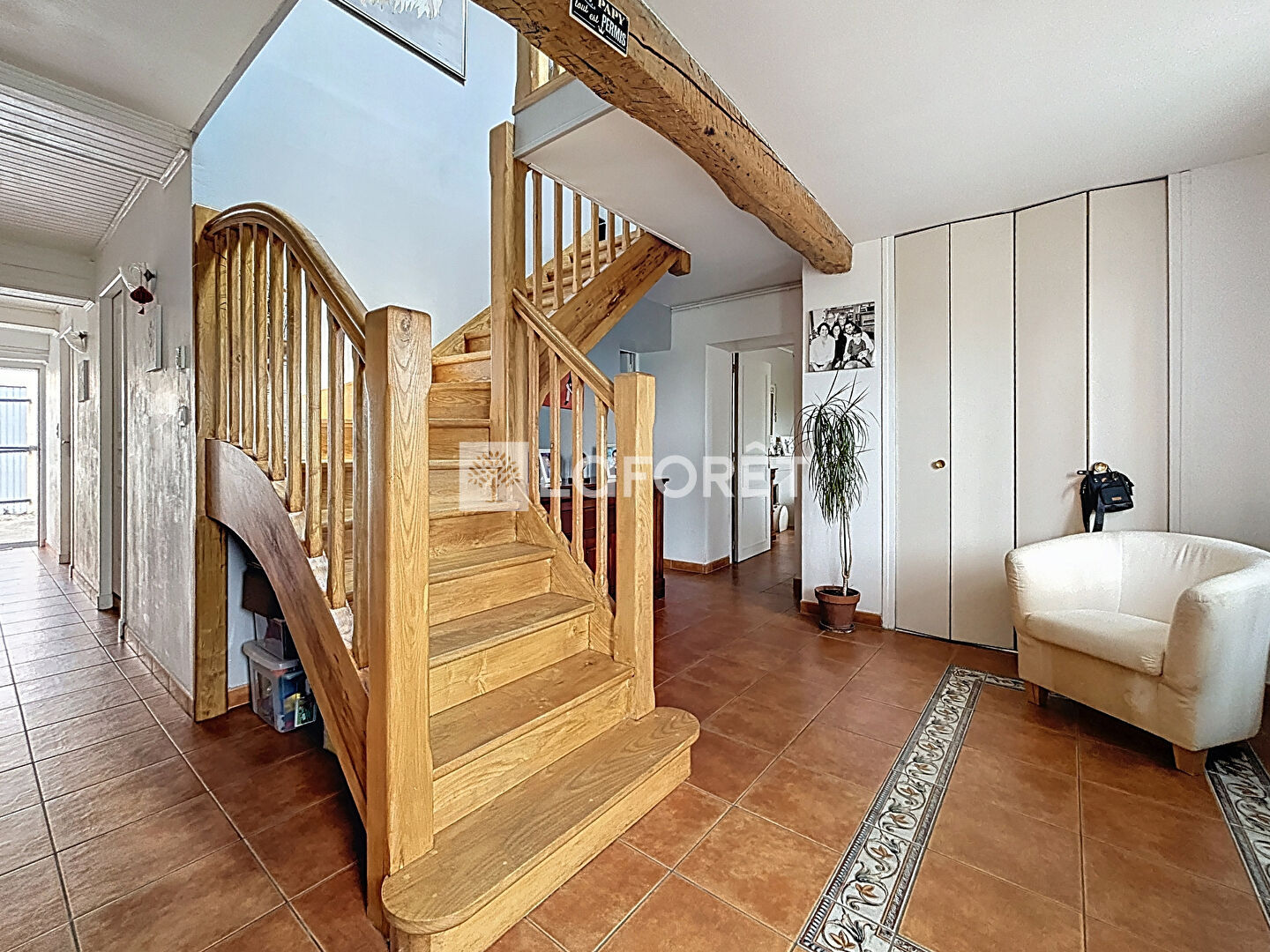 Dès l'entrée, vous serez accueilli par un vaste hall qui met en valeur un magnifique escalier, véritable pièce maîtresse de la maison.