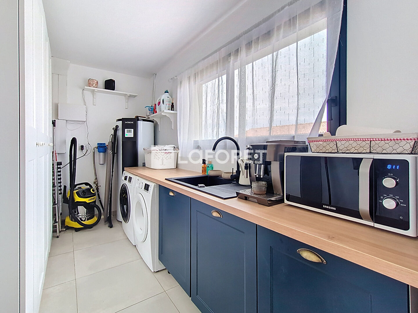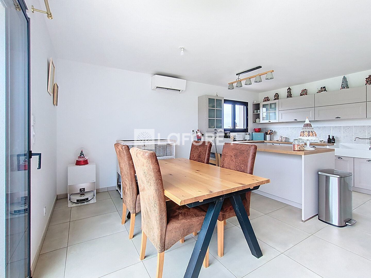 Elle s'ouvre sur une entrée avec placards, donnant sur un vaste séjour lumineux comprenant un salon avec accès direct à la terrasse extérieure, une salle à manger et une cuisine contemporaine, aménagée et entièrement équipée, bénéficiant elle aussi d'un accès vers un cellier idéal pour le rangement à proximité de la pièce de vie.