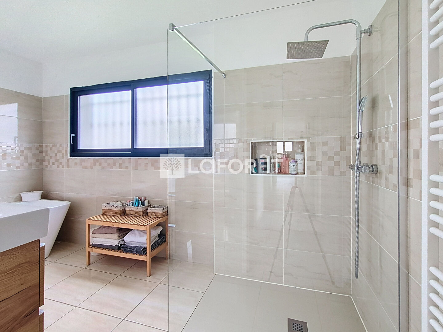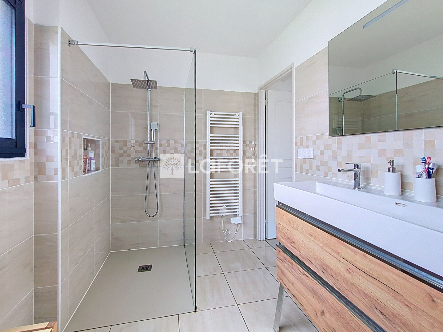Un couloir mène à l'espace nuit, composé d'une suite parentale avec grand dressing et accès direct à la terrasse, ainsi que de deux autres chambres dotées de placards intégrés. Vous y trouverez également une salle de bains équipée d'une douche à l'italienne, d'une baignoire, d'un meuble vasque et d'un sèche-serviettes électrique.