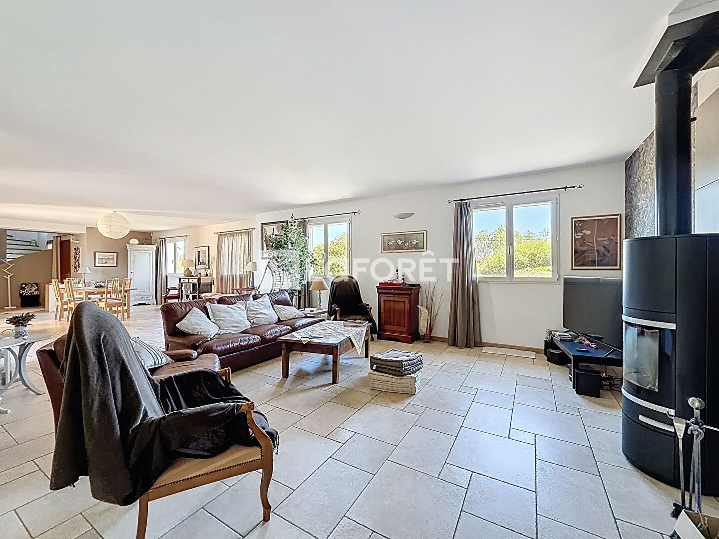 Grande pièce de vie lumineuse ouverte sur le jardin avec poêle à bois