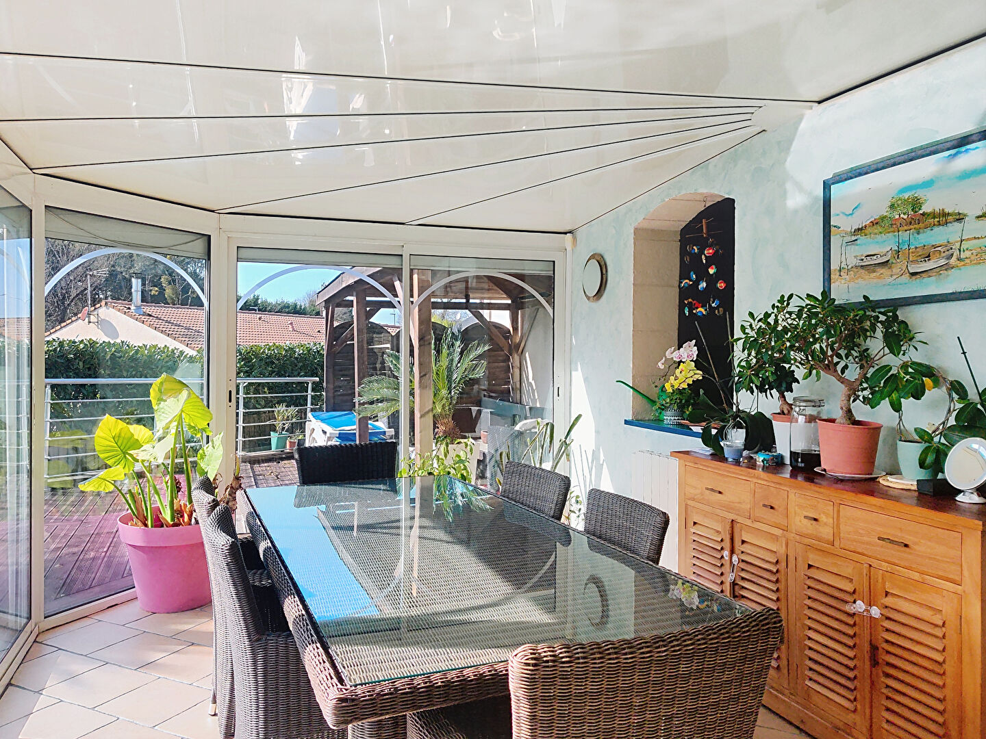 À l'extérieur, avec une exposition plein sud, vous pourrez pleinement profiter du coin terrasse et de la piscine.