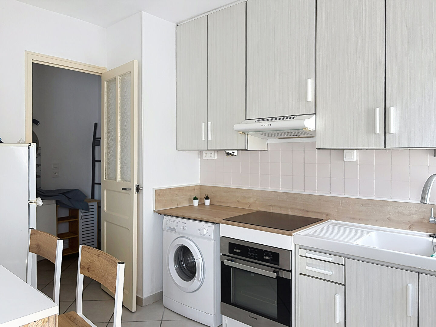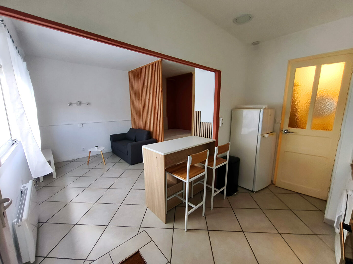 Le logement se compose d'une pièce de vie lumineuse avec un espace chambre légèrement séparé, permettant de créer un coin nuit plus intimiste. Le séjour ouvre sur une belle cuisine ouverte, aménagée et équipée, apportant un espace de vie convivial et fonctionnel.