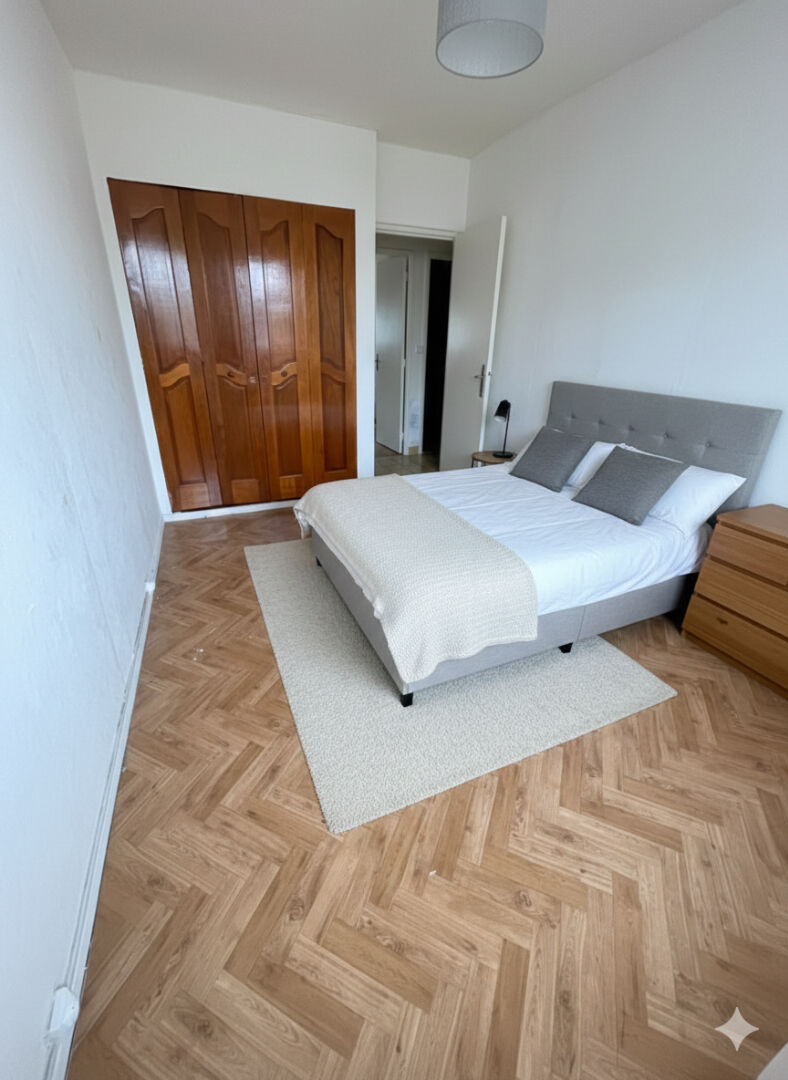 L'appartement se compose d'un double séjour lumineux de 22 m², bénéficiant d'un emplacement en retrait de la rue, garantissant calme et tranquillité. L'espace nuit comprend deux chambres, chacune équipée de placards de rangement, offrant un agencement fonctionnel et confortable.