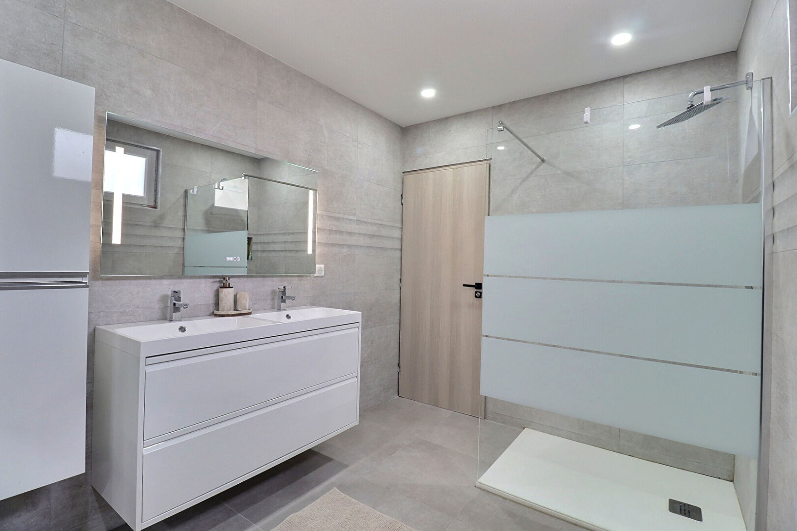 L'ensemble bénéficie d'un carrelage grand format effet marbre, d'un éclairage encastré et d'un design contemporain parfaitement maîtrisé.