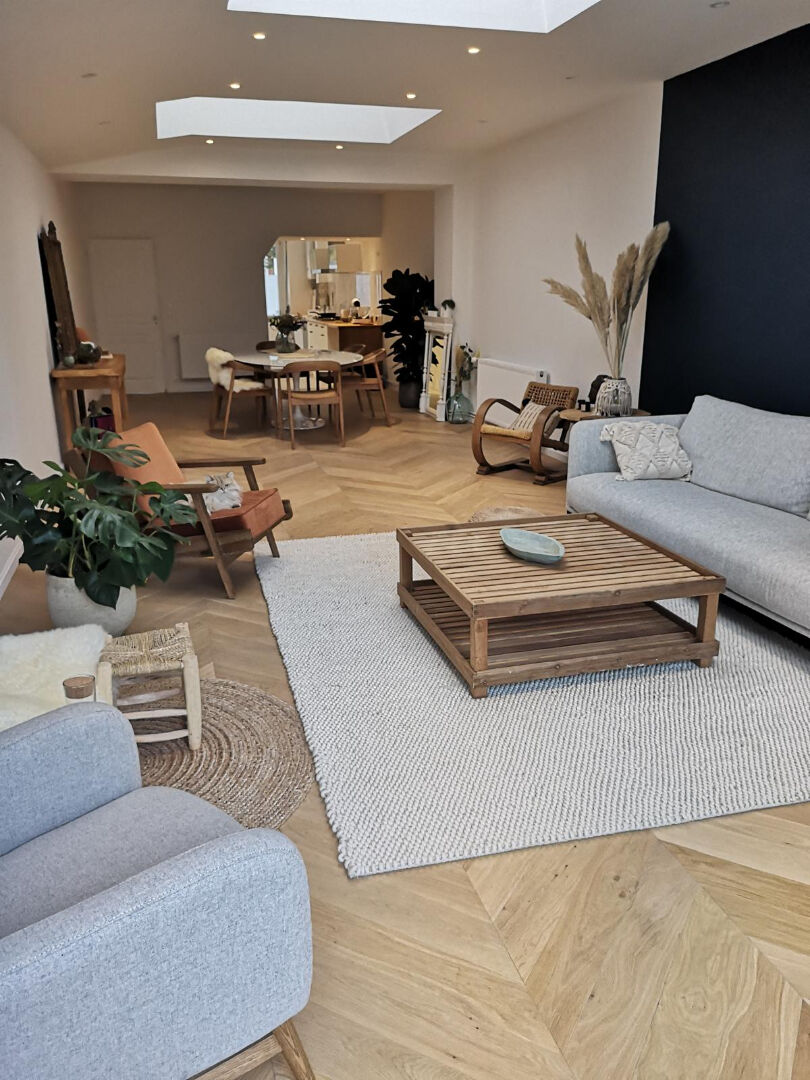 Dès l'entrée, la maison dévoile une atmosphère chaleureuse et contemporaine, baignée de lumière naturelle. Le séjour de plus de 50 m², ouvert sur le jardin, constitue un véritable espace de vie central. Il est sublimé par un parquet en pointe de Hongrie et par de nombreux puits de lumière qui renforcent la sensation d'espace. La cuisine attenante, neuve, entièrement équipée et parfaitement intégrée, complète harmonieusement cet ensemble convivial, idéal pour recevoir.