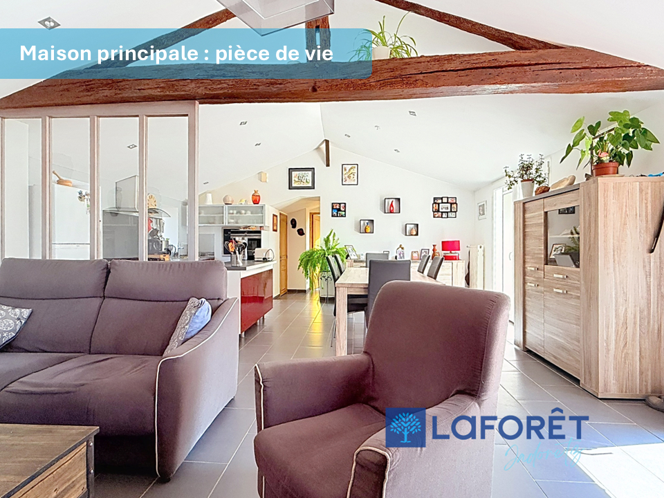 Avec 2 chambres dont une suite parentale, c'est une maison de pays baignée de lumière et tournée vers son ravissant jardin qui vous attend. La pièce de vie de 40 m² comprend un espace salon avec cheminée et une cuisine aménagée/équipée. La dépendance attenante est composée d'un salon et d'une chambre, une salle d'eau, un wc et un garage. Cet espace peut être réinventé selon vos besoins ! L'extérieur propose une cave en pierre de 15 m² (pompe puits, évier, électricité), un cabanon en bois, un abri de jardin, une belle terrasse carrelée avec sa pergola et un terrain de pétanque avec son espace de repas convivial et abrité ! Jardin arboré de fruitiers, potager, poulailler sur la parcelle clôturée entièrement et fermée par un portail motorisé (visiophone). Entrée en enrobé, éclairages extérieurs. Puits et récupérateur d'eau. Atelier chaufferie