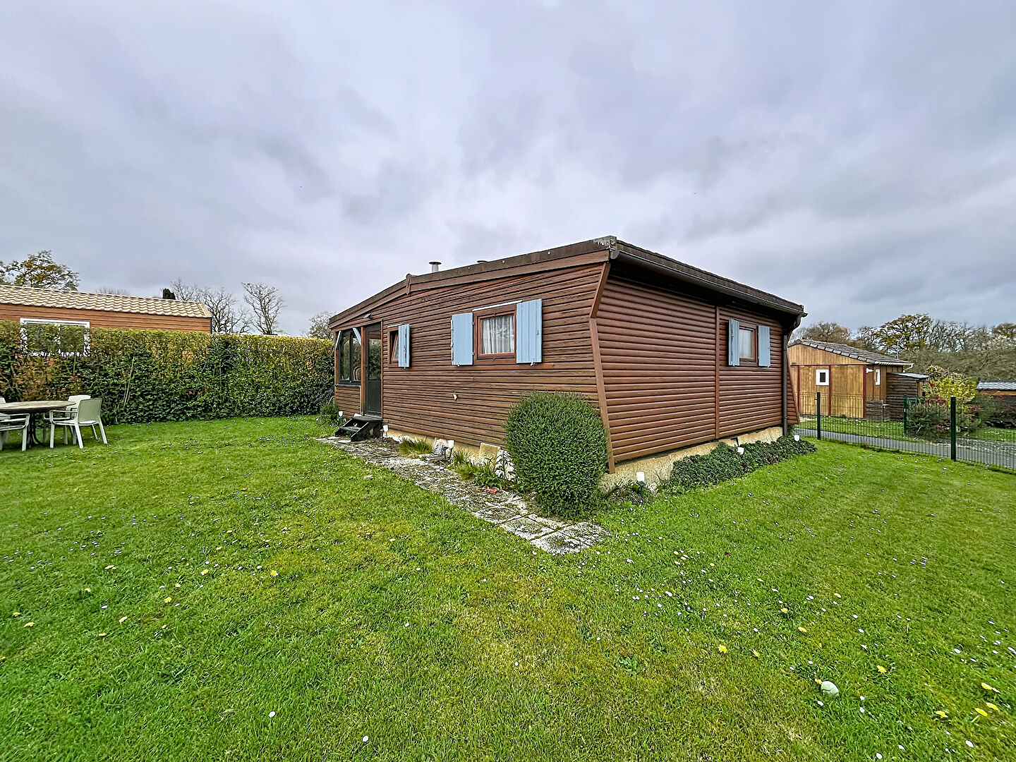 Dans un parc résidentiel de loisirs offrant piscine, courts de tennis et aire de jeux, un chalet en bois édifié sur une parcelle de 250m².