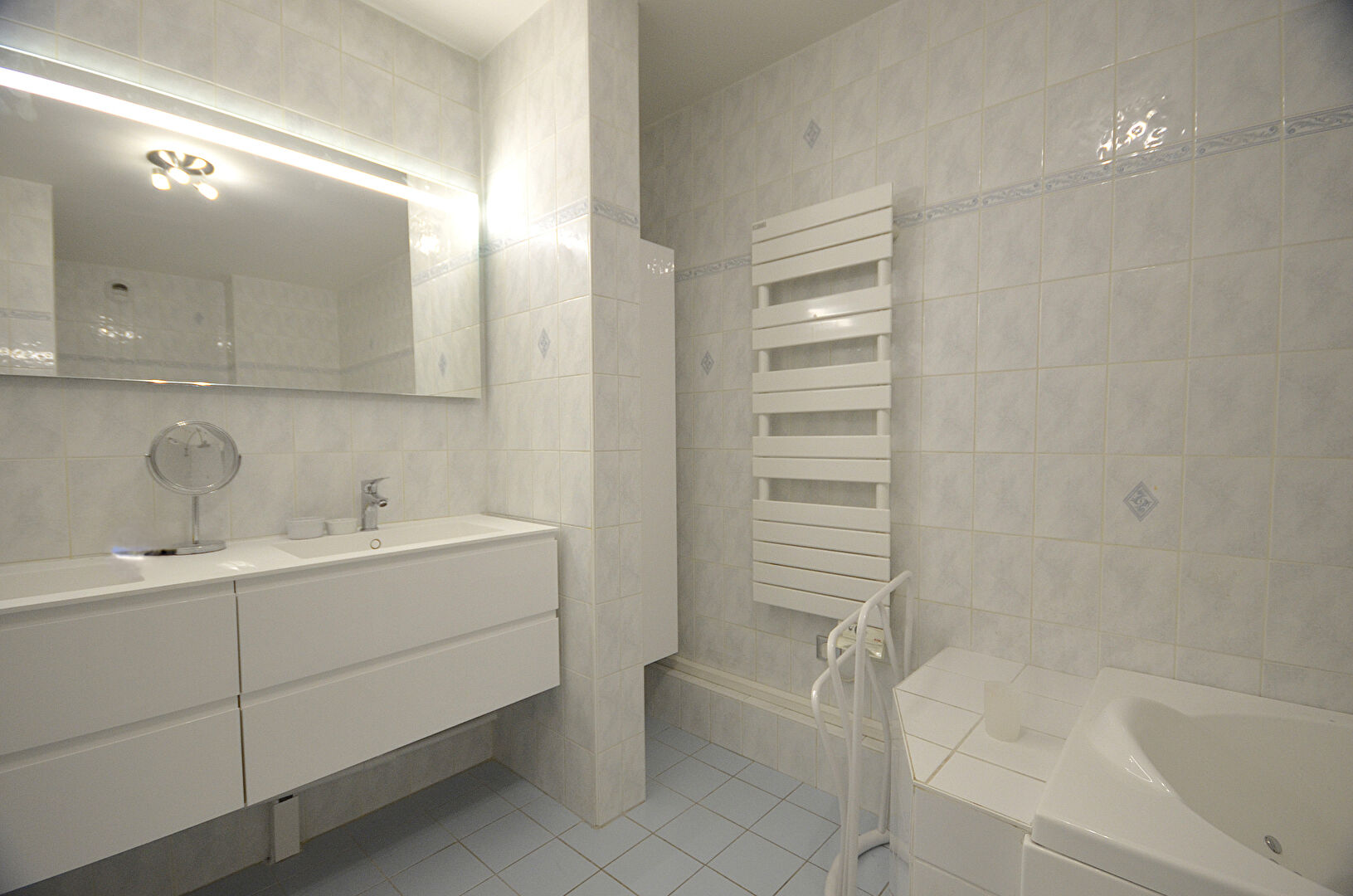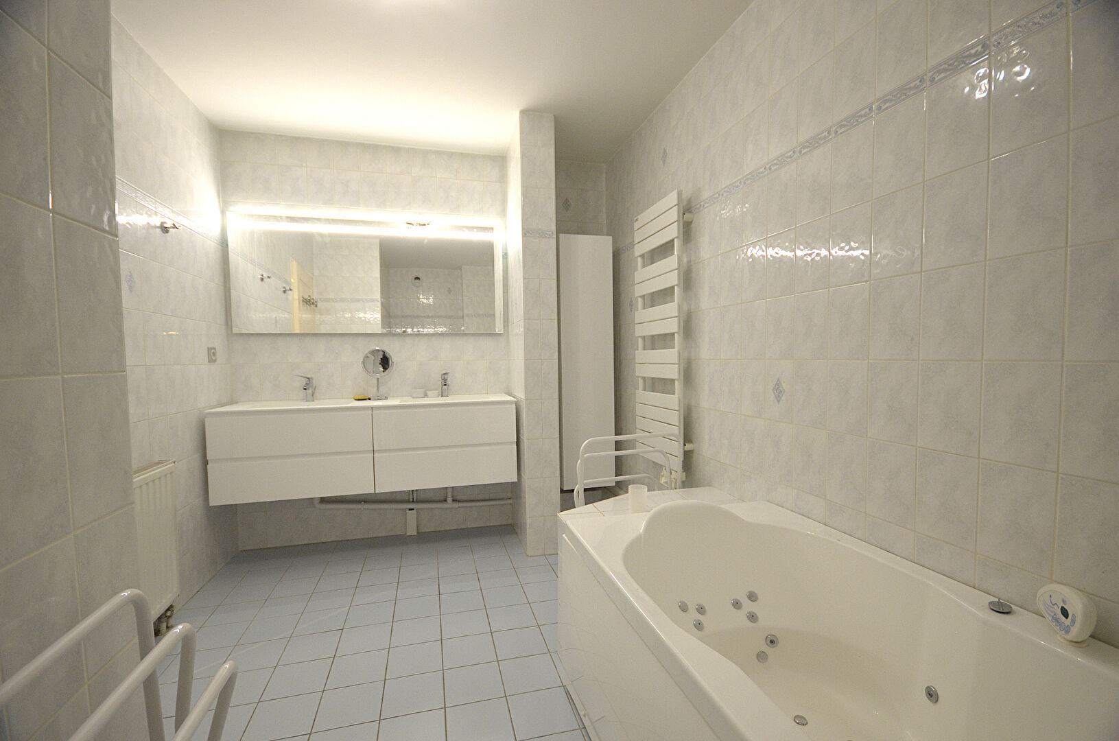 Salle de bains spacieuse de 8 m² avec baignoire balnéo.