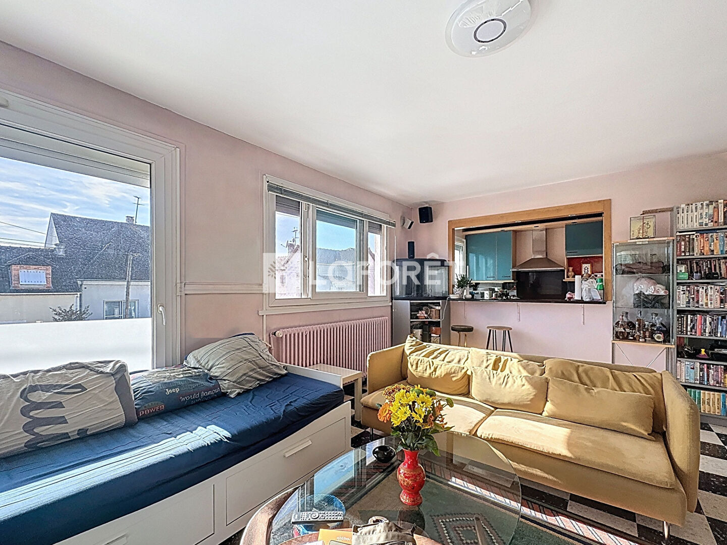 Au premier étage, vous trouverez le salon avec une cuisine américaine, 2 chambres ainsi qu'une salle de bain et des wc.