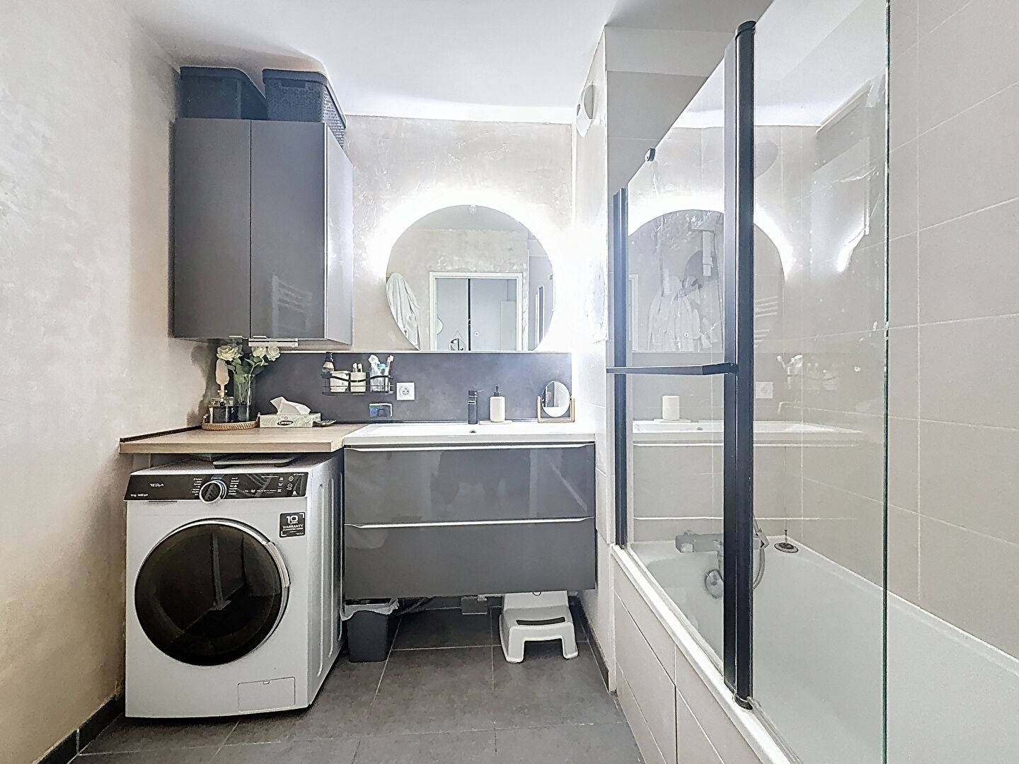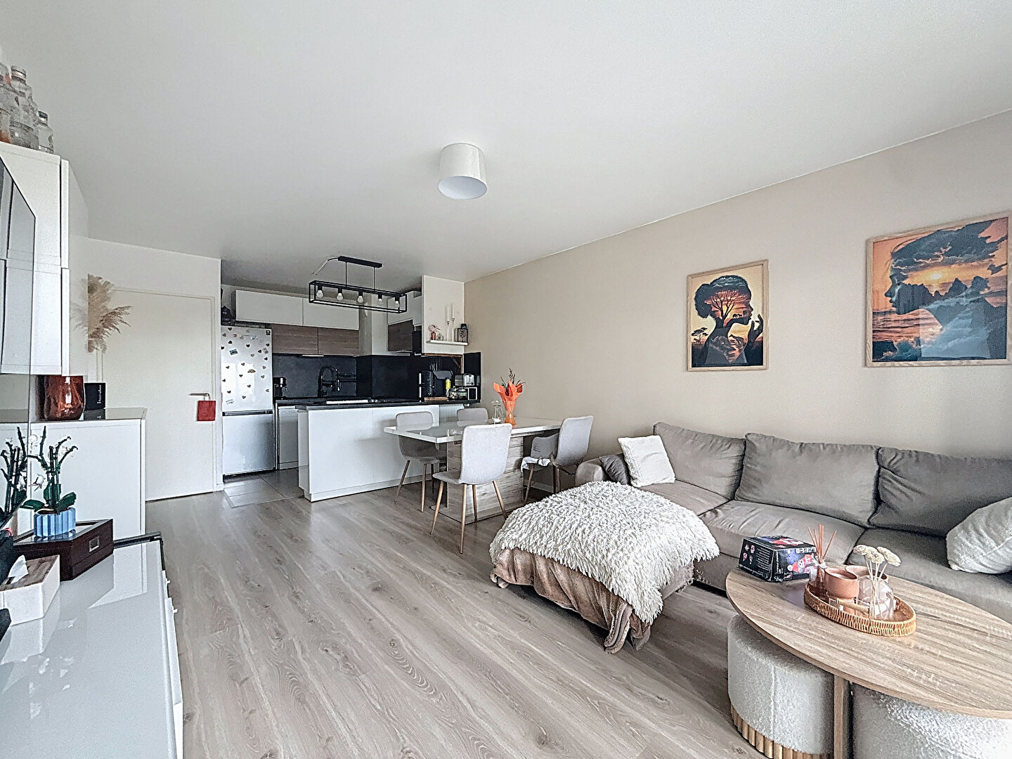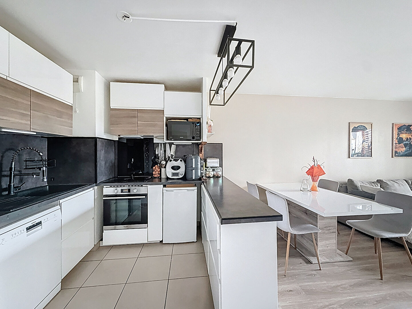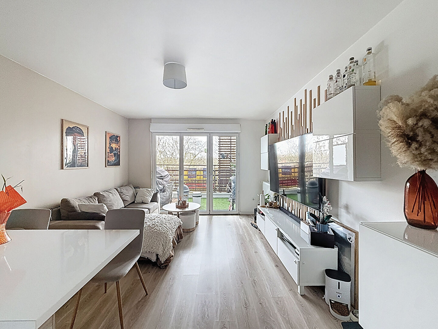 L'appartement bénéficie d'une distribution fonctionnelle et agréable. Il s'ouvre sur une entrée avec WC indépendant, desservant un bel espace de vie lumineux composé d'une cuisine ouverte, aménagée et équipée, ainsi que d'un séjour donnant accès direct au balcon.